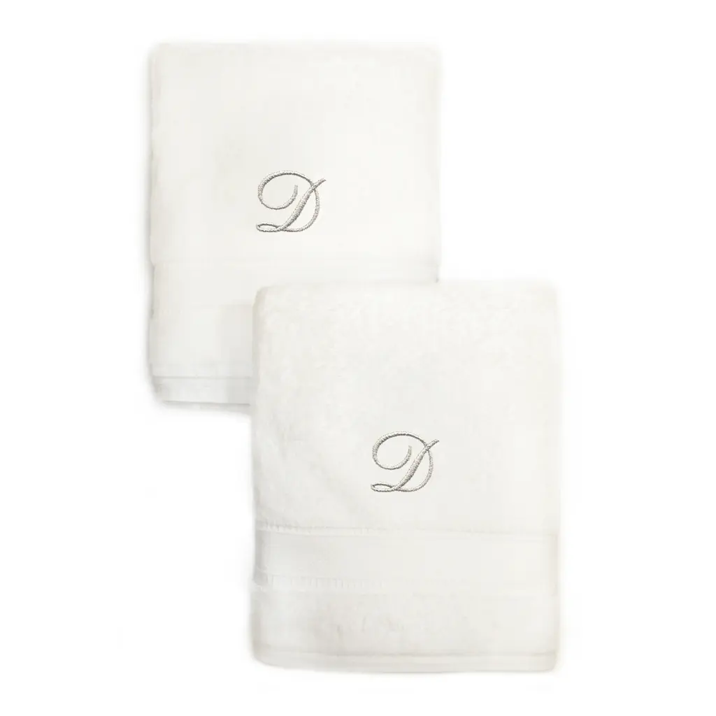 These authentic plush hotel and spa hand towels are made from high end Turkish cotton with a beautiful embroidered silver script initial of your choice monogrammed on each towel. These 700 gram Turkish cotton bath towels are made for 5 star luxury hotels and spas and become softer and more absorbent with every wash. The digital images we display have the most accurate color possible. However, due to differences in computer monitors, we cannot be responsible for variations in color between the actual product and your screen. Soft, thick and very absorbentThese long lasting towels are designed for heavy use and become softer with each washWill not pill or shedIncludes set of 2 hand towelPattern: White embroidered with the initial of your choice in silver scriptType of cotton: TurkishConstruction: Looped terryclothMaterials: 100 percent Turkish cottonCare instructions: Machine washableMade in TurkeyDimensions: 16 inches wide x 30 inches long Product Features: Monogrammed Material: Turkish Cotton Pattern: Embroidered, Solid Color Set Include: 2 Piece Care Instruction: Machine Wash Towel: Hand Towels, Guest Towels Color: White, Silver