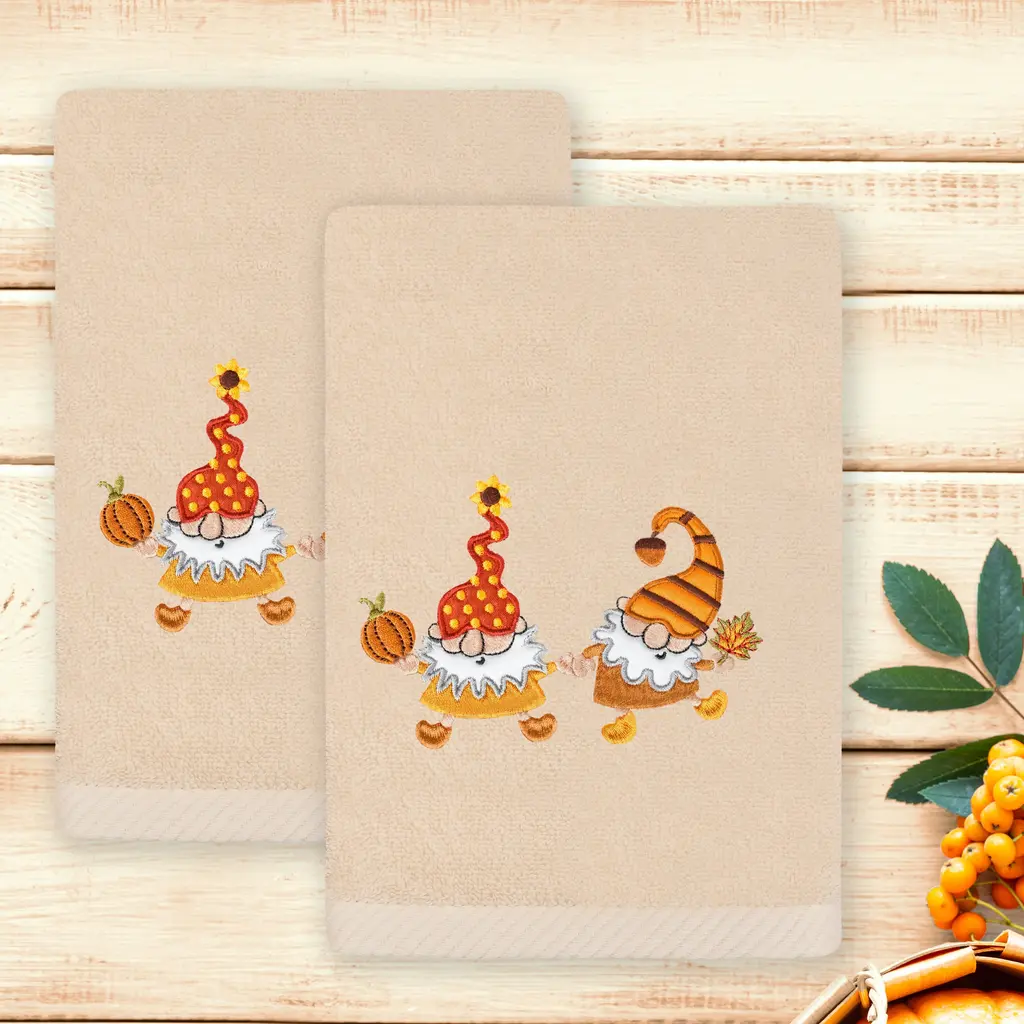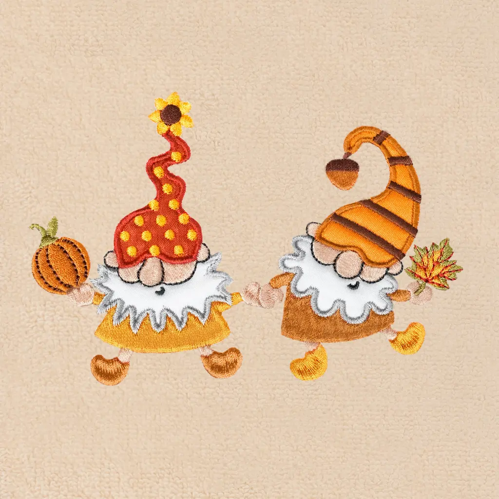Bring a playful autumn spirit to your decorations with colorful, embroidered hand towels for your guest bath. These AUTUMN GNOMES towels feature applique dancing bearded gnomes with intricate seasonal details. These special & luxurious autumn towels are made of the finest 100% Turkish cotton for maximum softness and absorbency. The AUTUMN GNOMES towels will add a whimsical mood to your festivities and make a great gift! Embroidered Gnomes Design100% Genuine Turkish CottonMachine wash cold, no bleach, line dry or dry clean.Available in color options white or sandSet includes 2 embroidered hand towels (16" x 30")Made in TurkeyProudly Embellished in USA