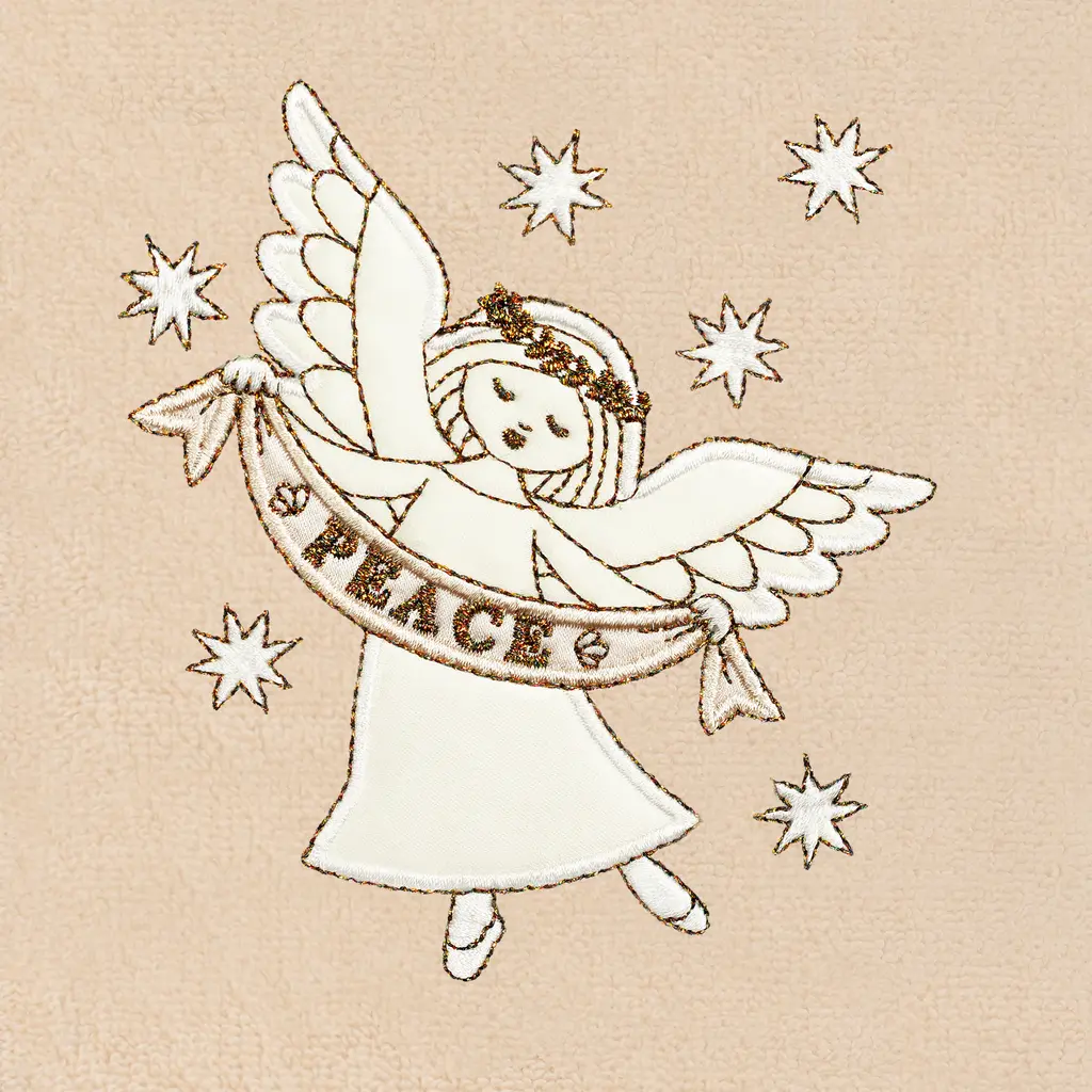 Bring a serene Christmas spirit to your decorations with elegant embroidered hand towels for your guest bath. These Christmas ANGEL towels feature a lustrous applique angel with sparkling details. This special & luxurious Christmas towel is manufactured with more cotton per square inch for maximum softness and absorbency. The Christmas ANGEL towels will add a peaceful mood to your holiday and make a great gift! • Embroidered Christmas Angel Design • 100% Genuine Turkish Cotton • Machine wash cold, no bleach, line dry or dry clean. • Available in color options white or sand • Set includes 2 embroidered hand towels (16” x 30”) • Made in Turkey • Proudly Embellished in USA