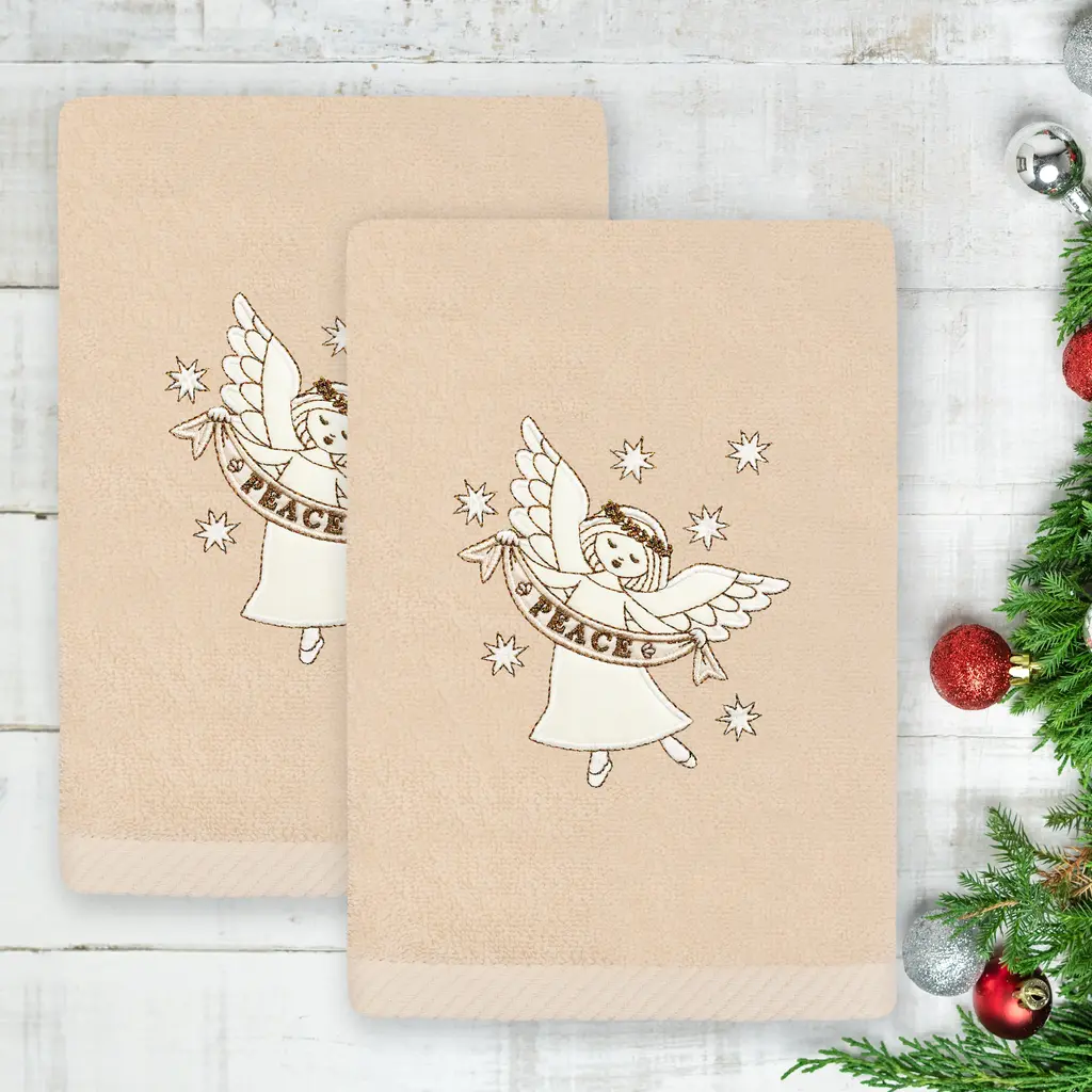 Authentic Hotel And Spa Christmas Angel Embroidered Luxury 100% Turkish Cotton Hand Towels Set Of 2 - Sand