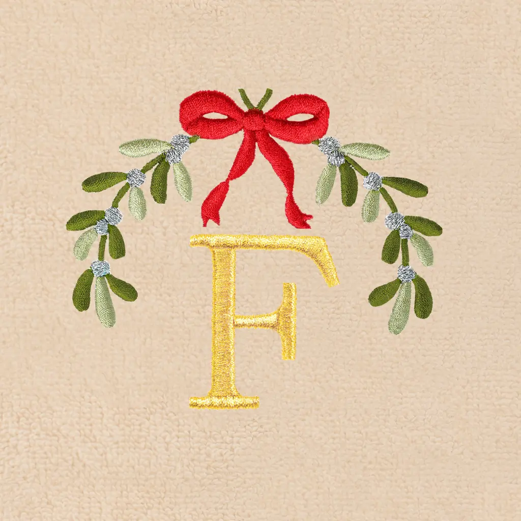 Bring a joyful Christmas spirit to your decorations with elegant embroidered hand towels for your guest bath. These Christmas MISTLETOE MONOGRAM towels feature sparkling branches held by a bow and a monogram of your choice. This special & luxurious Christmas towel is manufactured with more cotton per square inch for maximum softness and absorbency. The Christmas MISTLETOE MONOGRAM towels will add a merry mood to your festivities and make a great gift! • Embroidered Christmas Mistletoe Monogram Design • 100% Genuine Turkish Cotton • Machine wash cold, no bleach, line dry or dry clean. • Available in color options white or sand • Set includes 2 embroidered hand towels (16” x 30”) • Made in Turkey • Proudly Embellished in USA