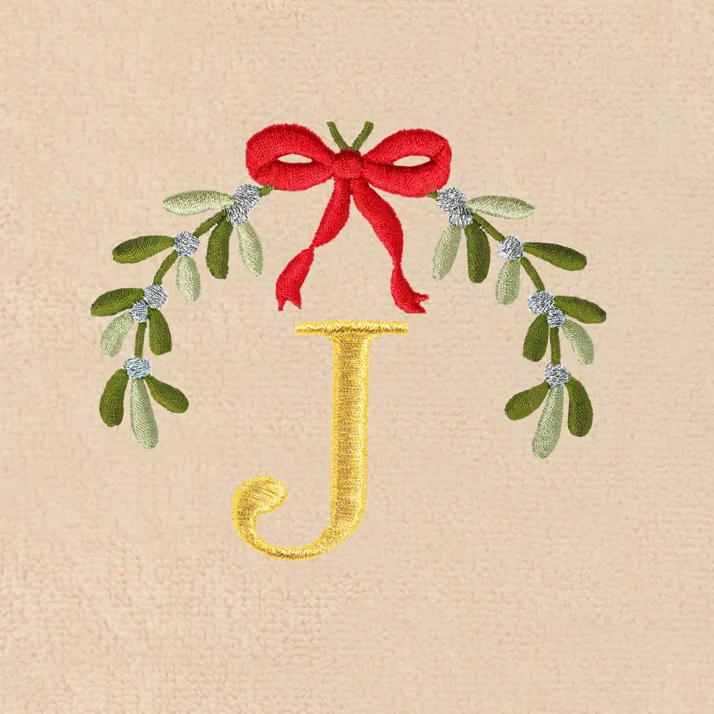 Bring a joyful Christmas spirit to your decorations with elegant embroidered hand towels for your guest bath. These Christmas MISTLETOE MONOGRAM towels feature sparkling branches held by a bow and a monogram of your choice. This special & luxurious Christmas towel is manufactured with more cotton per square inch for maximum softness and absorbency. The Christmas MISTLETOE MONOGRAM towels will add a merry mood to your festivities and make a great gift! • Embroidered Christmas Mistletoe Monogram Design • 100% Genuine Turkish Cotton • Machine wash cold, no bleach, line dry or dry clean. • Available in color options white or sand • Set includes 2 embroidered hand towels (16” x 30”) • Made in Turkey • Proudly Embellished in USA