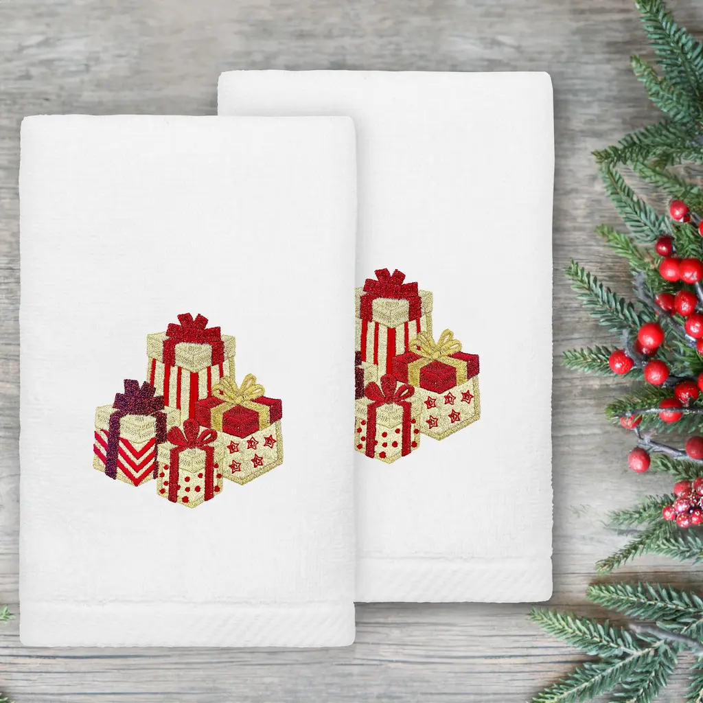 Bring a joyous Christmas spirit to your decor with these elegant embroidered hand towels, perfect for your guest bath. The CHRISTMAS PACKAGES towels feature festive gift boxes in golden and ruby tones, adding a merry touch to your holiday celebrations. These luxurious Christmas towels are crafted with more cotton per square inch, ensuring maximum softness and absorbency. The Christmas Packages design towels creates a sparkling mood and makes a great gift. • Embroidered Christmas Packages design • 100% Genuine Turkish Cotton • Machine wash cold, no bleach, line dry or dry clean. • Available in white or sand color options • Set includes 2 embroidered hand towels (16” x 30”) • Made in Turkey • Designed and embellished in the USA