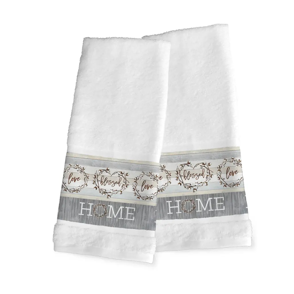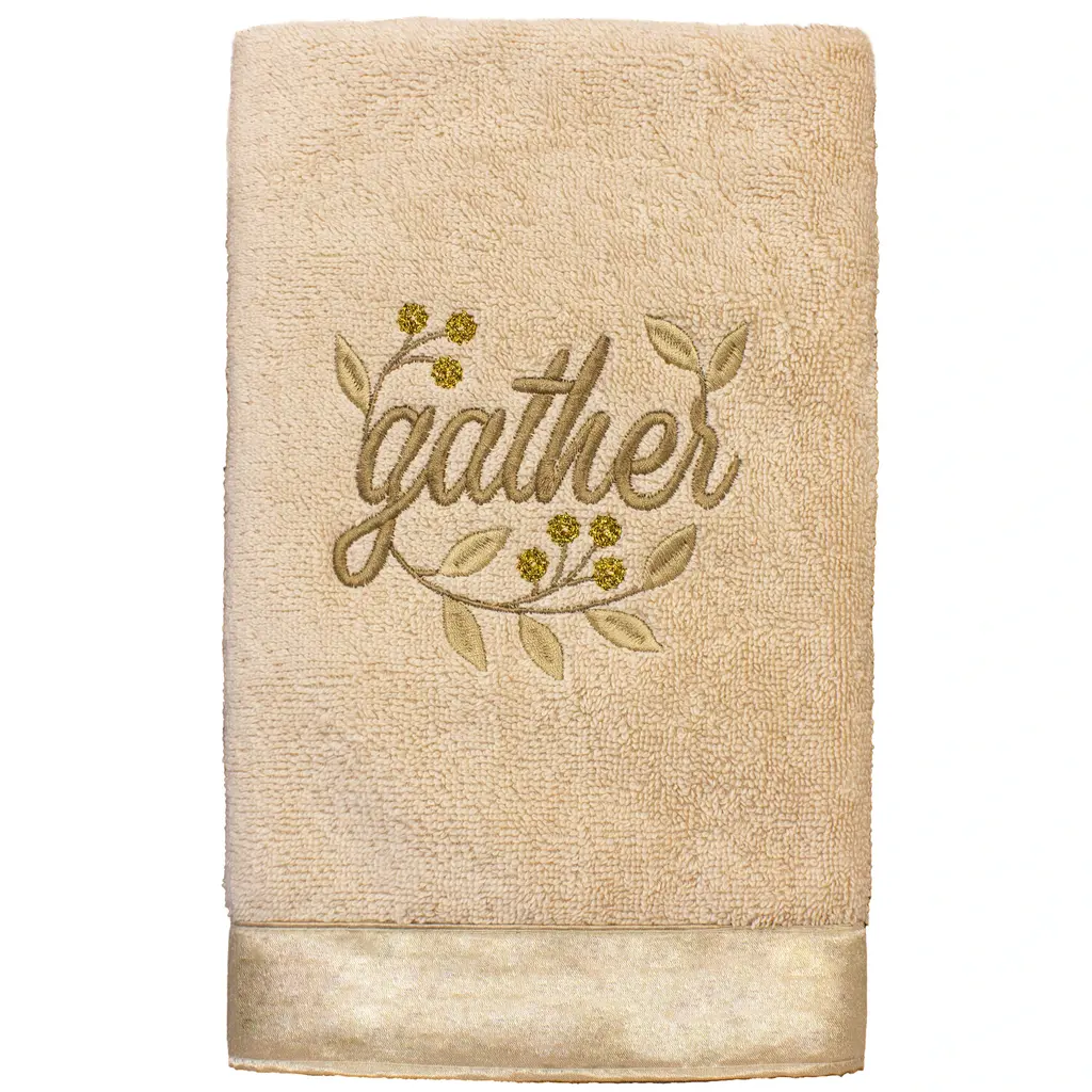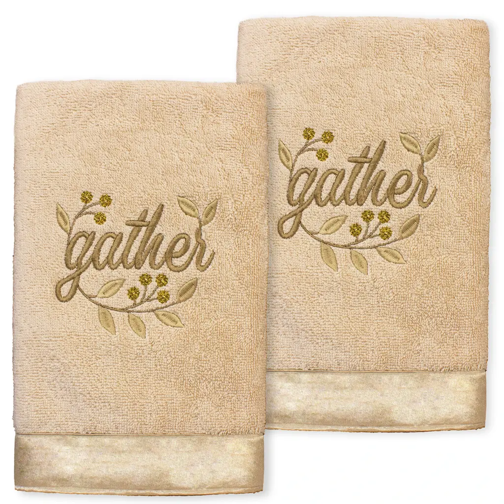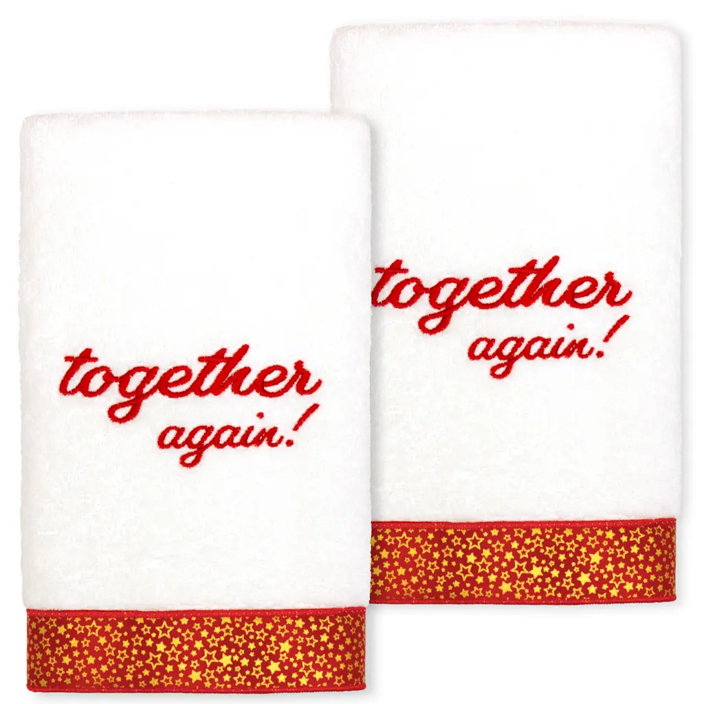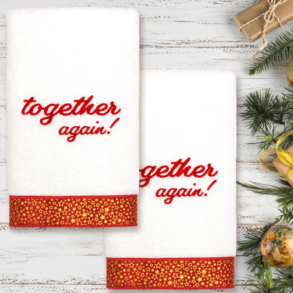 Your Christmas decorations are not complete without festive embroidered hand towels for the comfort of your family and guests. These hand towels feature an embroidered sentiment of the season and are trimmed with the sparkling border of printed metallic stars. Cloud soft and super absorbent, these luxurious, durable terry hand towels keep their plush appearance after washing. The Christmas Together Again hand towels bring cheerful holiday spirit and richness to your home decor and make a great gift!Embroidered Sentiment with 100% cotton metallic printed border 100% Genuine Turkish Cotton Machine wash cold, no bleach, line dry or dry clean Available in color options white or sand Set includes 2 embroidered hand towels (16" x 30") Made in Turkey Proudly Embellished in USA