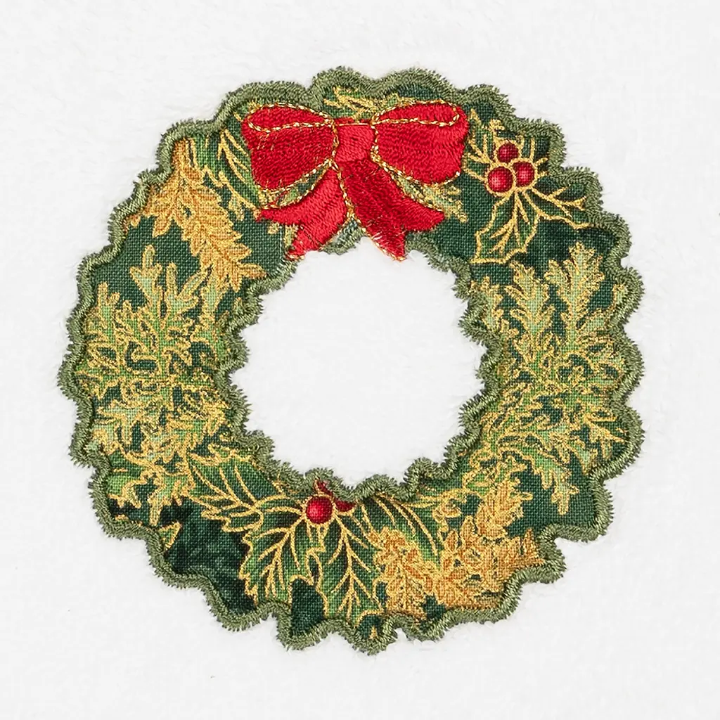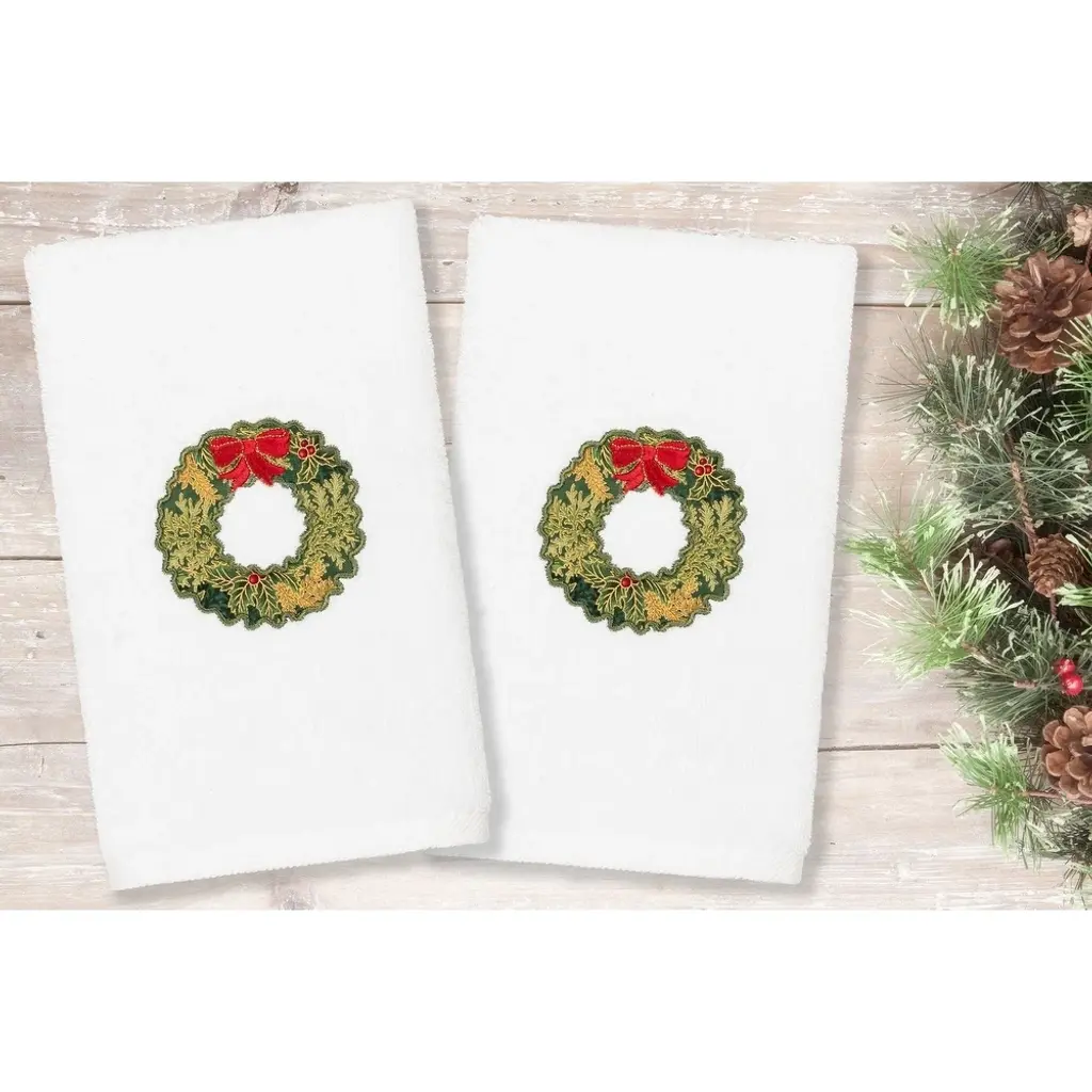 Bring a joyous Christmas spirit to your decorations with elegant embroidered hand towels for your guest bath. These "Christmas Wreath" towels feature a metallic patterned wreath decorated with a lustrous red bow, which will add a merry mood to your festivities. This special & luxurious Christmas terry hand towel is manufactured with the finest Turkish cotton fiber for maximum softness and absorbency. Embroidered Christmas Wreath Design 100% Genuine Turkish Cotton Machine wash cold, no bleach, line dry or dry clean Available in color options white or sand Set includes 2 embroidered hand towels (16" x 30") Embellished in USA Made in Turkey