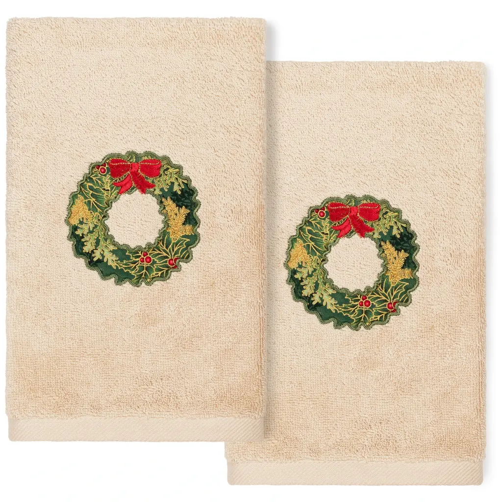 Authentic Hotel And Spa Christmas Wreath Embroidered Luxury 100% Turkish Cotton Hand Towels (Set Of 2) - Sand