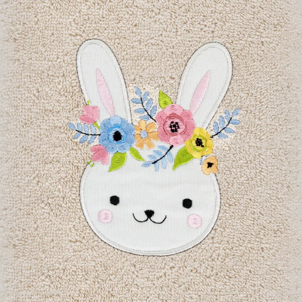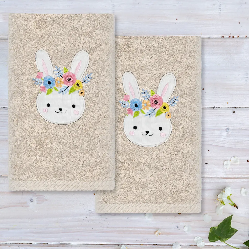 Your spring decorations are not complete without cute embroidered hand towels for the pleasure of your family and guests. These towels feature a smiling bunny wearing a crown of spring blooms. Special & luxurious, the Flower Crown terry hand towels are manufactured with the finest Turkish cotton for maximum softness and absorbency. And these durable hand towels keep their plush appearance after washing. The Flower Crown hand towels bring springtime spirit to your home decor and make a great gift!Embroidered Bunny & Floral Design 100% Genuine Turkish Cotton Machine wash cold, no bleach, line dry or dry clean Available in color options white or sand Set includes 2 embroidered hand towels (16" x 30") Made in Turkey Proudly Embellished in USA
