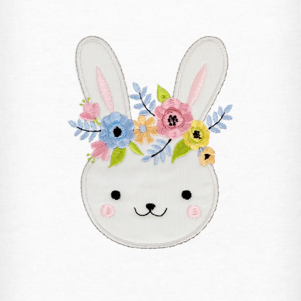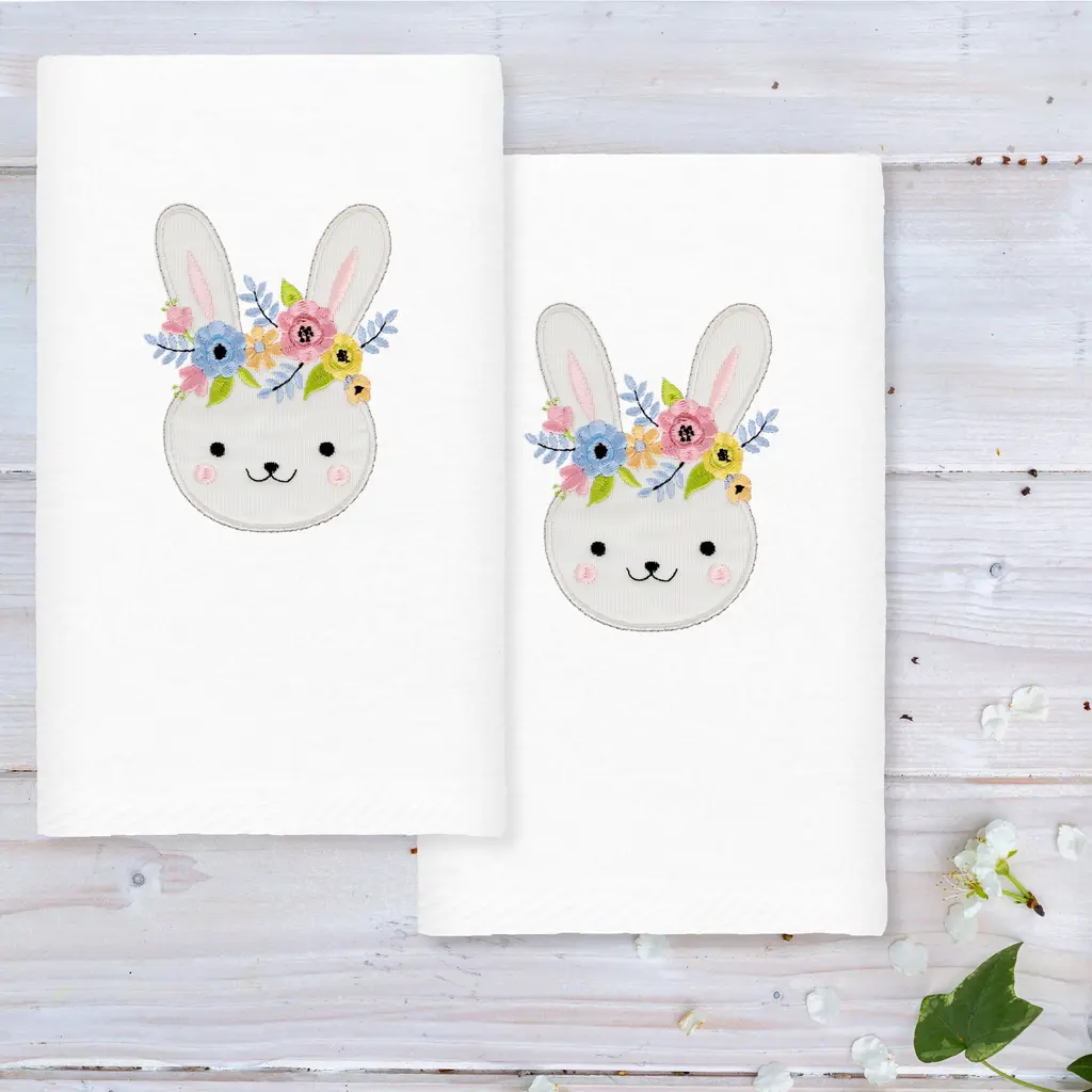 Your spring decorations are not complete without cute embroidered hand towels for the pleasure of your family and guests. These towels feature a smiling bunny wearing a crown of spring blooms. Special & luxurious, the Flower Crown terry hand towels are manufactured with the finest Turkish cotton for maximum softness and absorbency. And these durable hand towels keep their plush appearance after washing. The Flower Crown hand towels bring springtime spirit to your home decor and make a great gift!Embroidered Bunny & Floral Design 100% Genuine Turkish Cotton Machine wash cold, no bleach, line dry or dry clean Available in color options white or sand Set includes 2 embroidered hand towels (16" x 30") Made in Turkey Proudly Embellished in USA