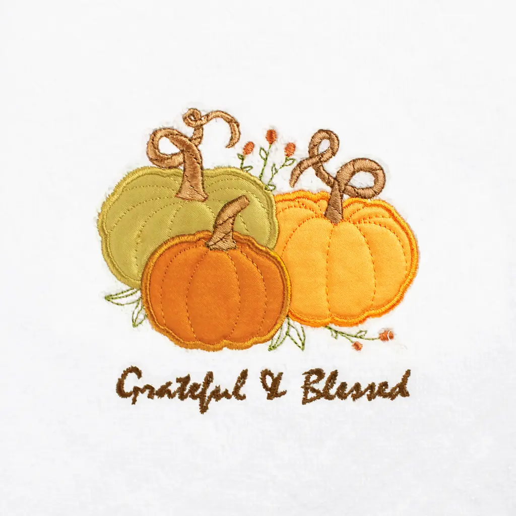Your autumn decorations are not complete without inspirational embroidered hand towels for your guest bath. "Grateful & Blessed" hand towels feature bright and lustrous pumpkins appliques and holiday sentiments. These special & luxurious terry hand towels are manufactured with the finest Turkish cotton fiber for maximum softness and absorbency, and bring a cheery harvest spirit to your home.Embroidered Pumpkin Design 100% Genuine Turkish Cotton Machine wash cold, no bleach, line dry or dry clean Available in color options white or sand Set includes 2 embroidered hand towels (16" x 30") Made in Turkey Proudly Embellished in USA