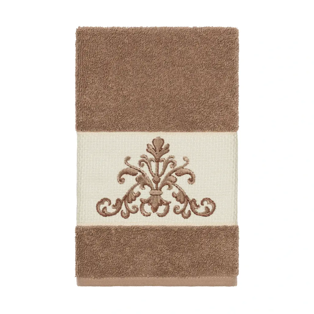 This authentic hotel and spa hand towel is made from plush, high end Turkish cotton for supreme absorbency and durability. This beautiful latte brown towel is embellished with a scrollwork applique and embroidery design with a textured woven border to add that special touch to your bathroom.Includes: One (1) hand towel100-percent soft and absorbent Turkish cottonEmbellished with a design in a combination of applique and embroideryThis luxurious towel is produced in a state of the art green factory in Turkey which runs on 100-percent solar energyCare instructions: Machine wash and dryMade in TurkeyDimensions: Hand towel - 16 inches wide x 30 inches long