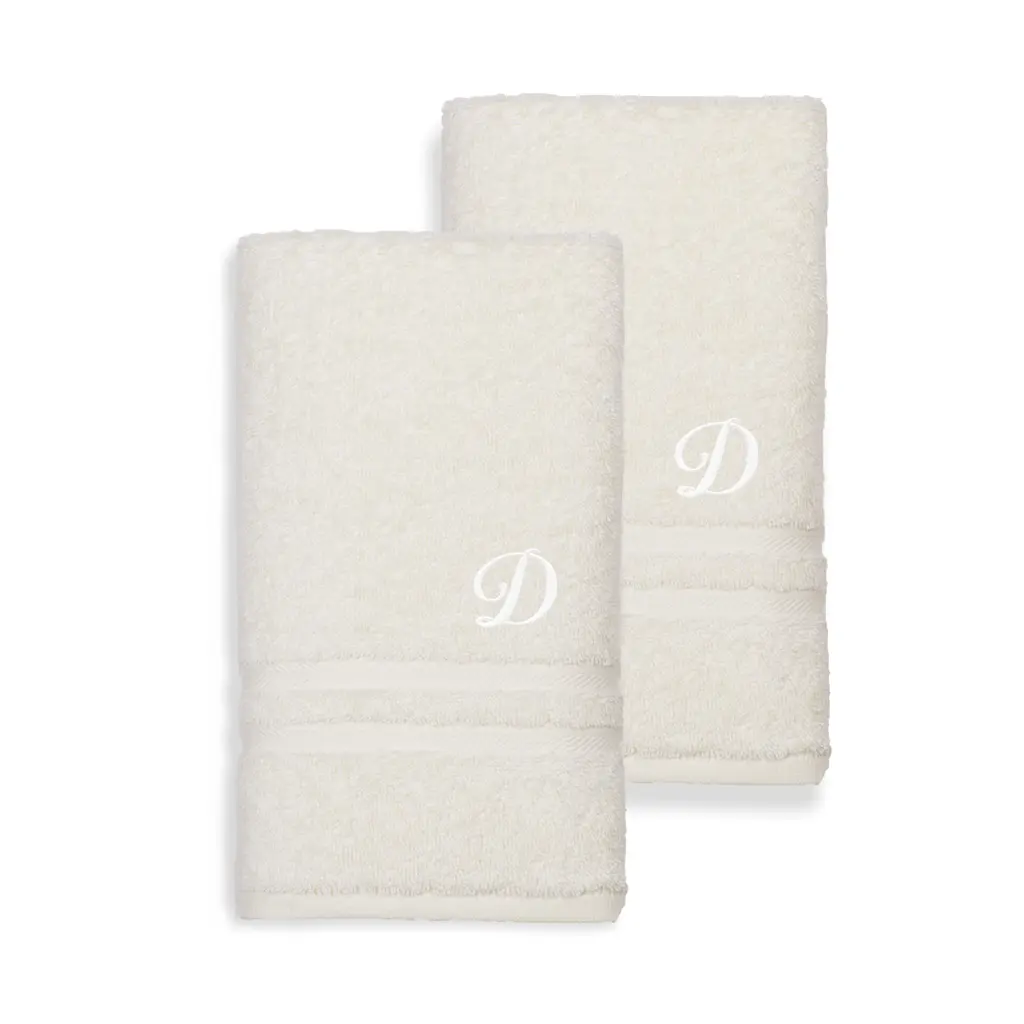 Dry your hands in luxury with these super soft, highly absorbent hand towels. The white-on-cream monogram adds subtle sophistication, while the Turkish cotton construction stays strong yet gets softer over time.Includes set of two (2) hand towelsSoft, thick and very absorbentLong-lasting towels designed for heavy useBecome softer with each washWill not pill or shedPattern: Cream solid terry with an embroidered white script initial of your choiceMaterials: 100 percent Turkish cottonCare instructions: Machine washableMade in TurkeyHand Towel: 16 inches wide x 30 inches longSet Includes: 2 PieceProduct Features: Monogrammed, Eco-FriendlyMaterial: Turkish CottonPattern: Solid Color, EmbroideredCare Instruction: Machine WashTowel: Hand Towels, Towel Sets, Decorative, Guest TowelsColor: White, Beige