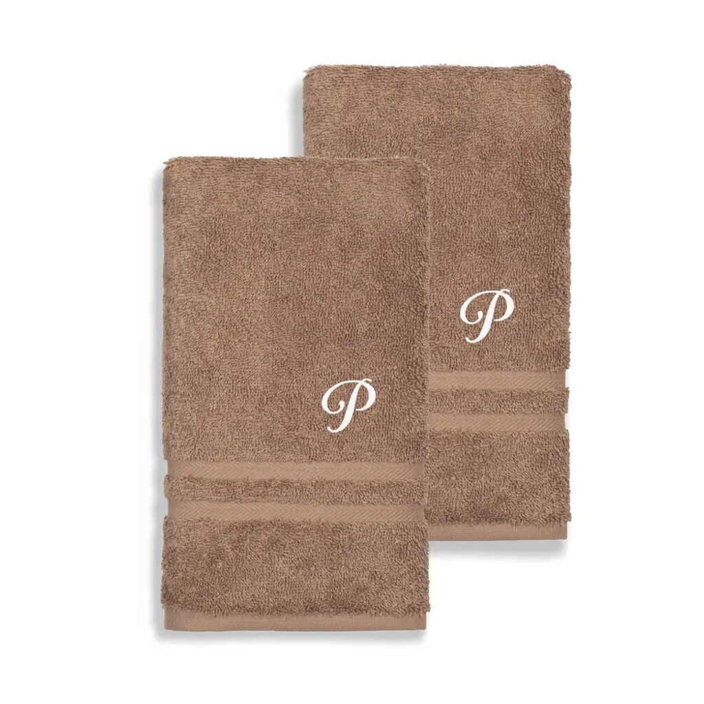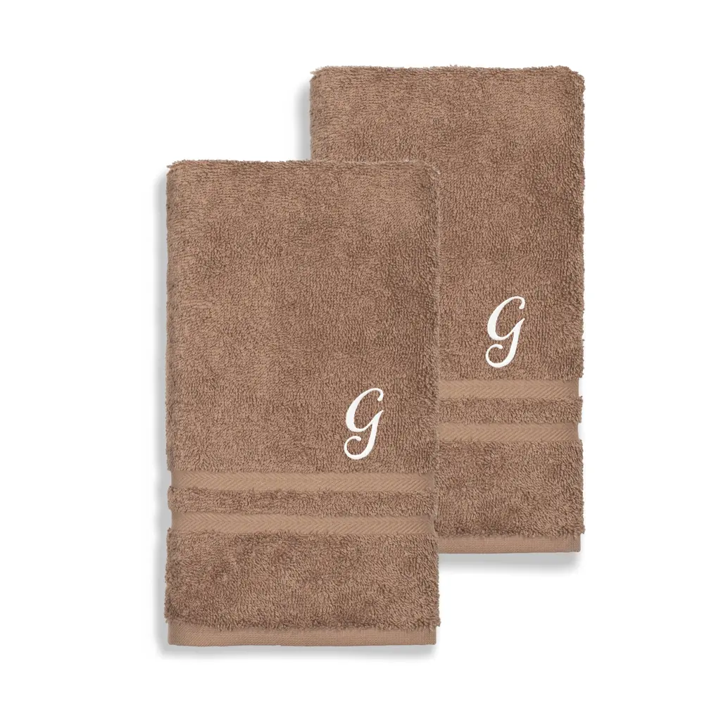 Welcome spa-quality luxury into your bathroom with this pair of Turkish cotton hand towels. These thick towels provide exceptional absorbency due to 100-percent Turkish cotton material, and their softness enhances with repeated use. Personalize these latte brown hand cloths with white monogrammed initials, while enjoying easy care and cleaning with machine washing.Includes set of two (2) hand towelsSoft, thick and very absorbentLong-lasting towels designed for heavy useBecome softer with each washWill not pill or shedPattern: Latte brown solid terry with an embroidered white script initial of your choiceMaterials: 100 percent Turkish cottonCare instructions: Machine washableMade in TurkeyHand Towel: 16 inches wide x 30 inches longSet Includes: 2 PieceProduct Features: Monogrammed, Eco-FriendlyMaterial: Turkish CottonPattern: Solid Color, EmbroideredCare Instruction: Machine WashTowel: Hand Towels, Towel Sets, Decorative, Guest TowelsColor: White, Brown