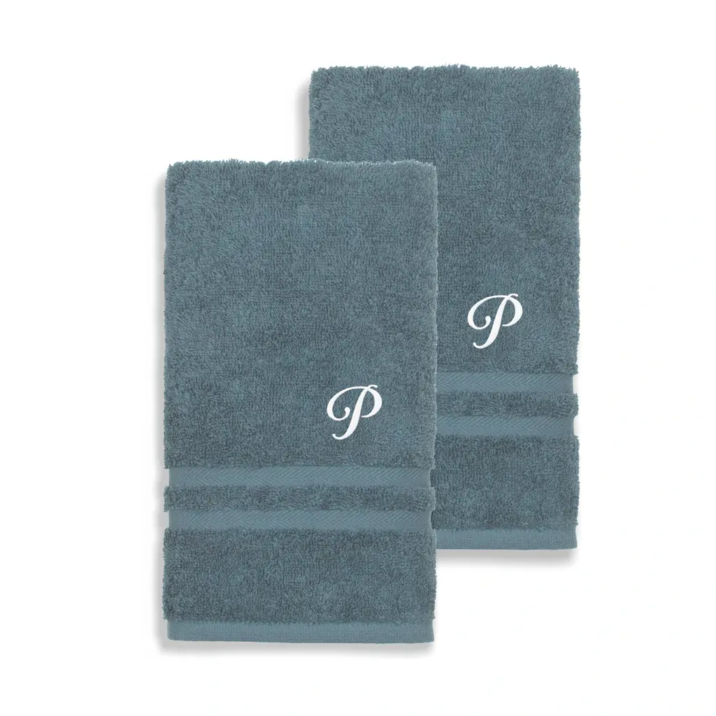 Pamper your family and guests with these luxurious monogrammed hand towels. The set includes two blue, durable, ultra-absorbent, 100-percent Turkish cotton towels monogrammed with a white script initial of your choice.Details:Set includes 2 hand towelsSoft, thick and very absorbentLong-lasting towels designed for heavy useBecome softer with each washWill not pill or shedMaterials: 100 percent Turkish cottonCare instructions: Machine washableMade in TurkeyProduct Features: Monogrammed, Eco-FriendlyPattern: Solid Color, EmbroideredCare Instruction: Machine WashTowel: Hand Towels, Towel Sets, Decorative, Guest TowelsColor: White, BlueHand Towel: 16 inches wide x 30 inches long