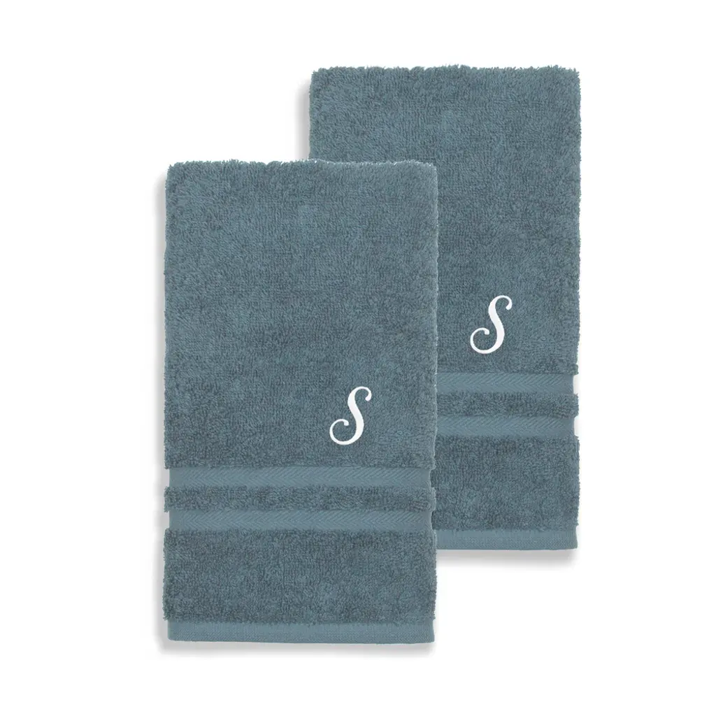 Pamper your family and guests with these luxurious monogrammed hand towels. The set includes two blue, durable, ultra-absorbent, 100-percent Turkish cotton towels monogrammed with a white script initial of your choice.Details:Set includes 2 hand towelsSoft, thick and very absorbentLong-lasting towels designed for heavy useBecome softer with each washWill not pill or shedMaterials: 100 percent Turkish cottonCare instructions: Machine washableMade in TurkeyProduct Features: Monogrammed, Eco-FriendlyPattern: Solid Color, EmbroideredCare Instruction: Machine WashTowel: Hand Towels, Towel Sets, Decorative, Guest TowelsColor: White, BlueHand Towel: 16 inches wide x 30 inches long