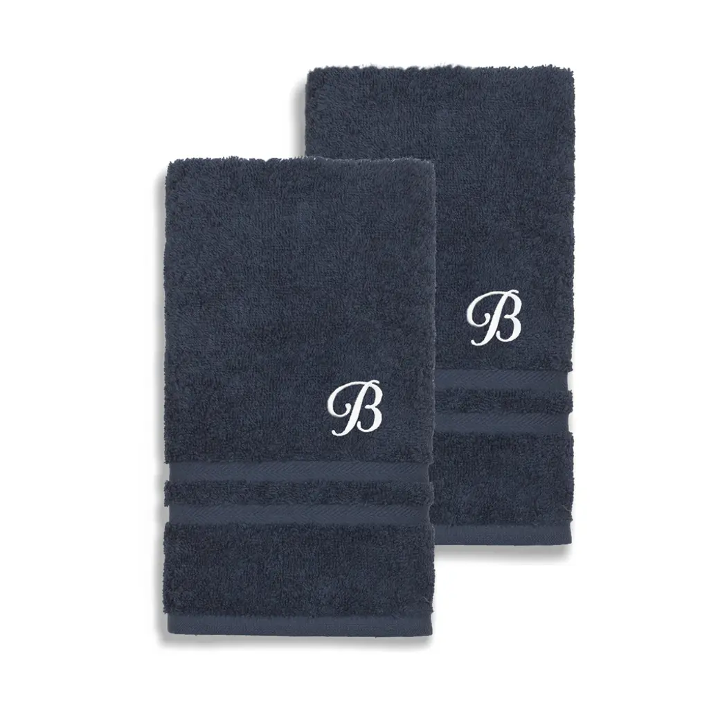 Luxuriate in absorbent bathroom comfort with these hotel and spa hand towels. Crafted from fine Turkish cotton, this two-piece set features elegant navy coloring and a customizable white monogram for a personalized hand-drying experience.Includes set of two (2) hand towelsSoft, thick and very absorbentLong-lasting towels designed for heavy useBecome softer with each washWill not pill or shedPattern: Navy blue solid terry with an embroidered white script initial of your choiceMaterials: 100 percent Turkish cottonCare instructions: Machine washableMade in TurkeyHand Towel: 16 inches wide x 30 inches longSet Includes: 2 PieceProduct Features: Monogrammed, Eco-FriendlyMaterial: Turkish CottonPattern: Solid Color, EmbroideredCare Instruction: Machine WashTowel: Hand Towels, Towel Sets, Decorative, Guest TowelsColor: White, Blue