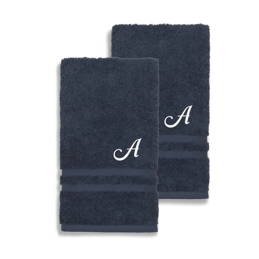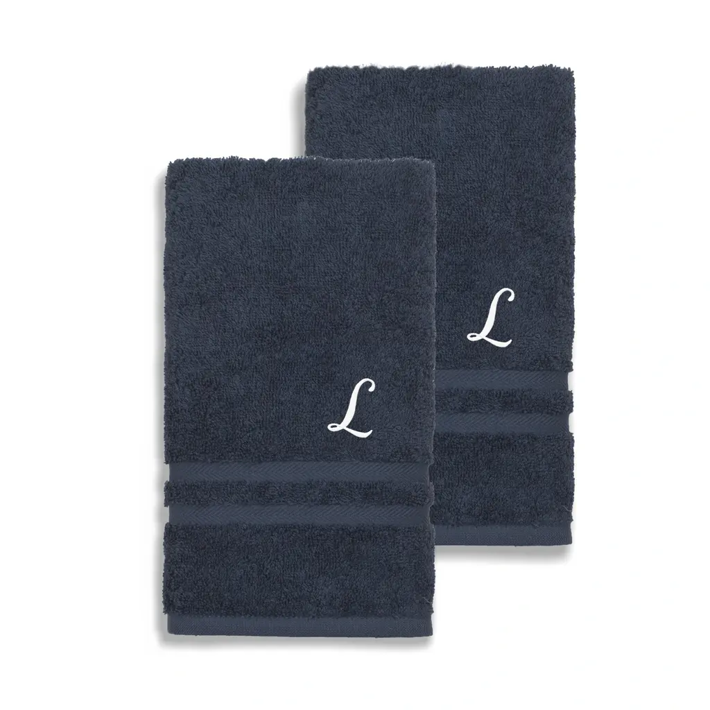 Luxuriate in absorbent bathroom comfort with these hotel and spa hand towels. Crafted from fine Turkish cotton, this two-piece set features elegant navy coloring and a customizable white monogram for a personalized hand-drying experience.Includes set of two (2) hand towelsSoft, thick and very absorbentLong-lasting towels designed for heavy useBecome softer with each washWill not pill or shedPattern: Navy blue solid terry with an embroidered white script initial of your choiceMaterials: 100 percent Turkish cottonCare instructions: Machine washableMade in TurkeyHand Towel: 16 inches wide x 30 inches longSet Includes: 2 PieceProduct Features: Monogrammed, Eco-FriendlyMaterial: Turkish CottonPattern: Solid Color, EmbroideredCare Instruction: Machine WashTowel: Hand Towels, Towel Sets, Decorative, Guest TowelsColor: White, Blue