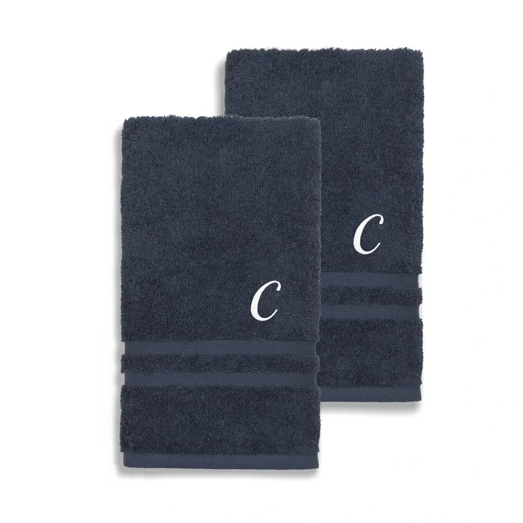 Luxuriate in absorbent bathroom comfort with these hotel and spa hand towels. Crafted from fine Turkish cotton, this two-piece set features elegant navy coloring and a customizable white monogram for a personalized hand-drying experience.Includes set of two (2) hand towelsSoft, thick and very absorbentLong-lasting towels designed for heavy useBecome softer with each washWill not pill or shedPattern: Navy blue solid terry with an embroidered white script initial of your choiceMaterials: 100 percent Turkish cottonCare instructions: Machine washableMade in TurkeyHand Towel: 16 inches wide x 30 inches longSet Includes: 2 PieceProduct Features: Monogrammed, Eco-FriendlyMaterial: Turkish CottonPattern: Solid Color, EmbroideredCare Instruction: Machine WashTowel: Hand Towels, Towel Sets, Decorative, Guest TowelsColor: White, Blue