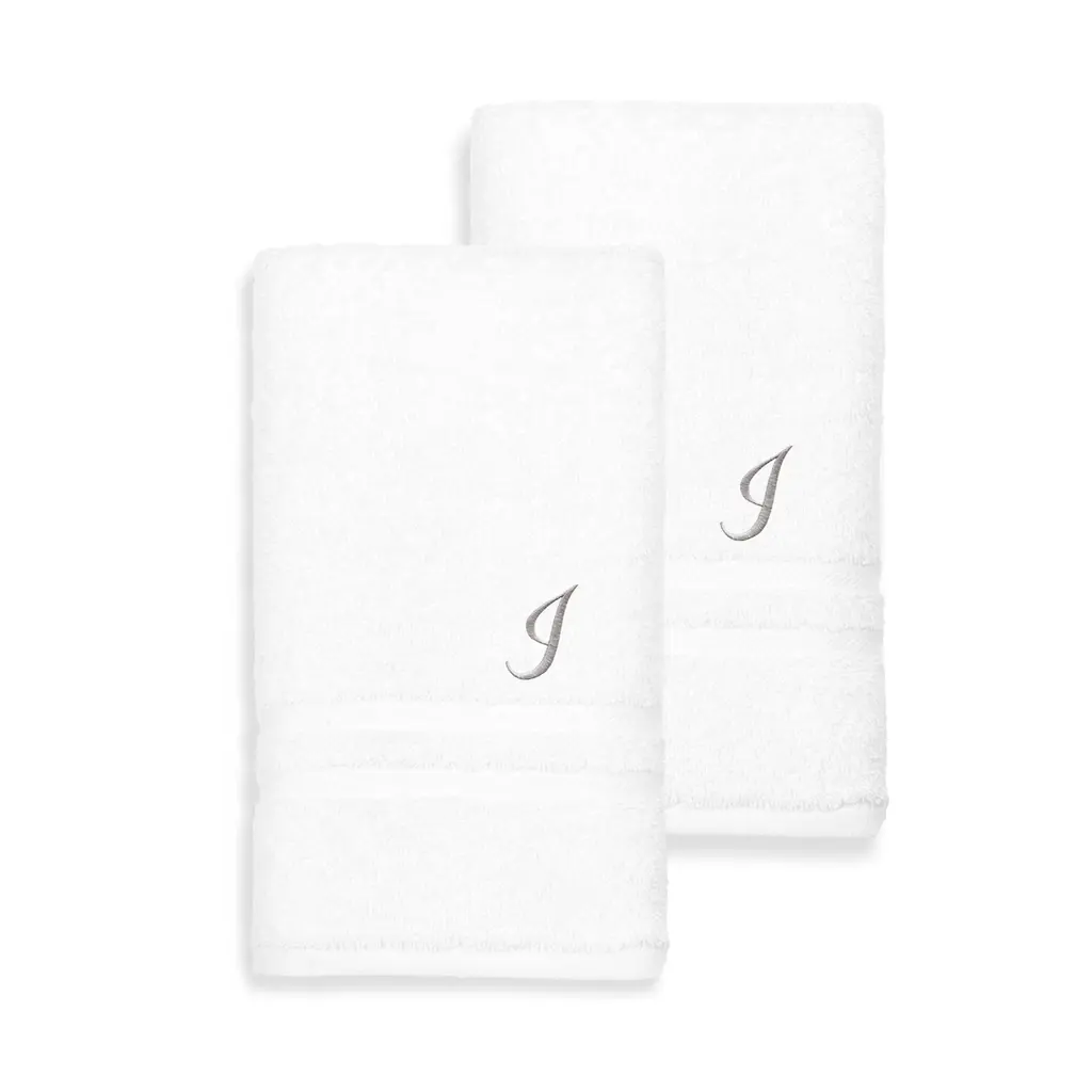 Mark your space in style with this set of monogrammed terry hand towels. This pair of towels features the elegant script initial of your choice for an upscale look in your bathroom. Soft, thick Turkish cotton construction makes the towels extra absorbent for quick and efficient hand-drying without pilling or shedding.Set includes 2 hand towelsSoft, thick and very absorbentLong-lasting towels designed for heavy useBecome softer with each washWill not pill or shedMaterials: 100 percent Turkish cottonCare instructions: Machine washableMade in TurkeyProduct Features: Monogrammed, Eco-FriendlyPattern: Solid Color, EmbroideredCare Instruction: Machine WashTowel: Hand Towels, Towel Sets, Decorative, Guest TowelsColor: White, GreyHand Towel: 16 inches wide x 30 inches long