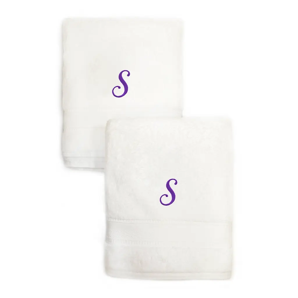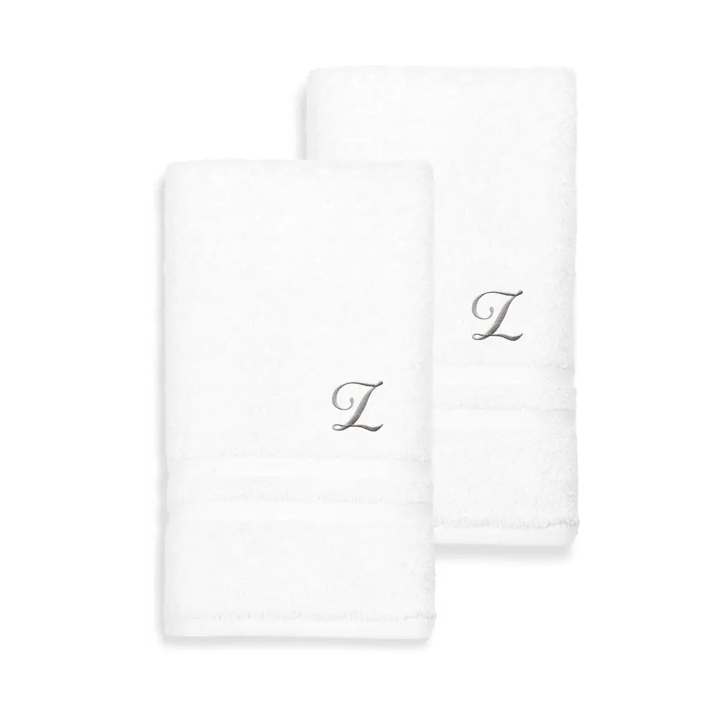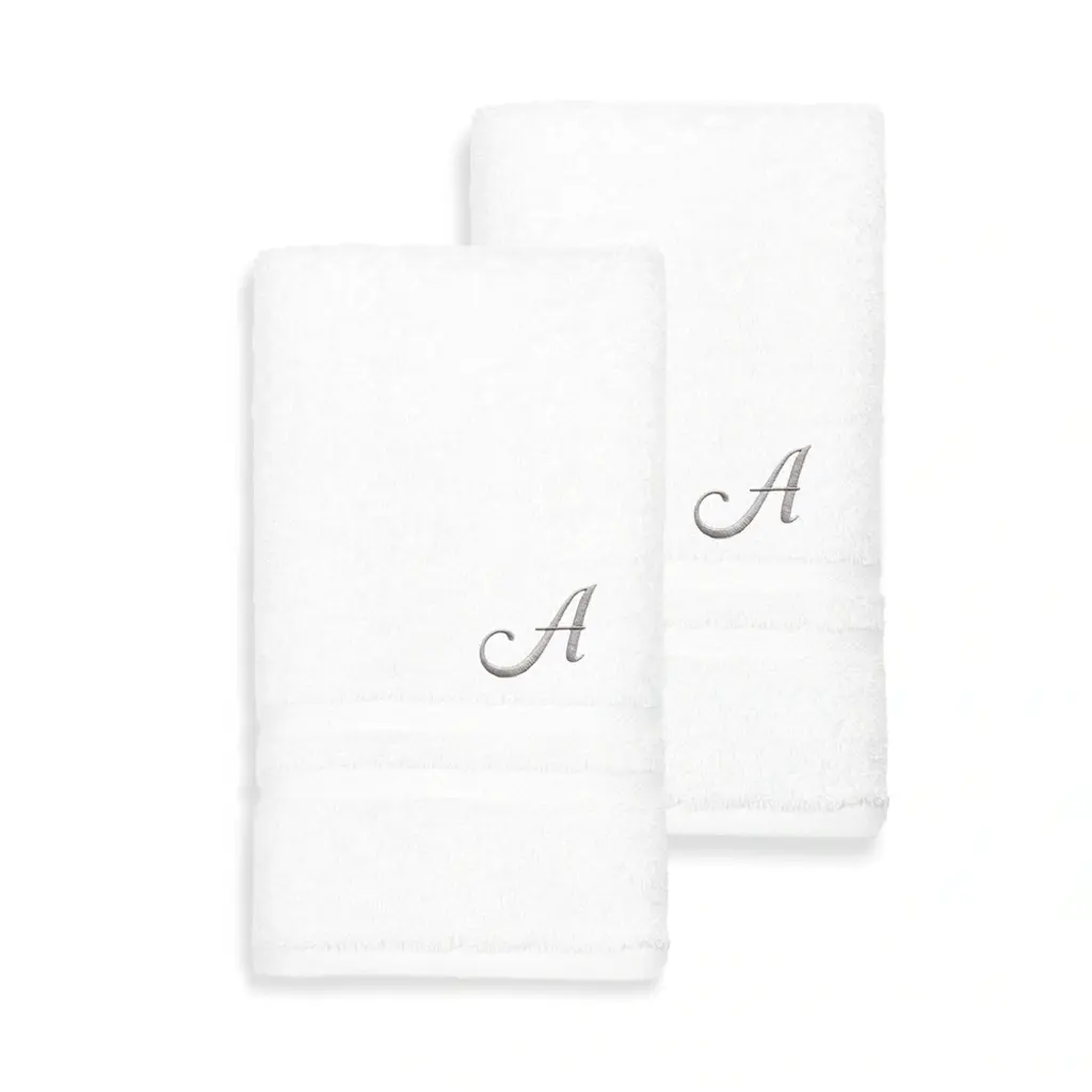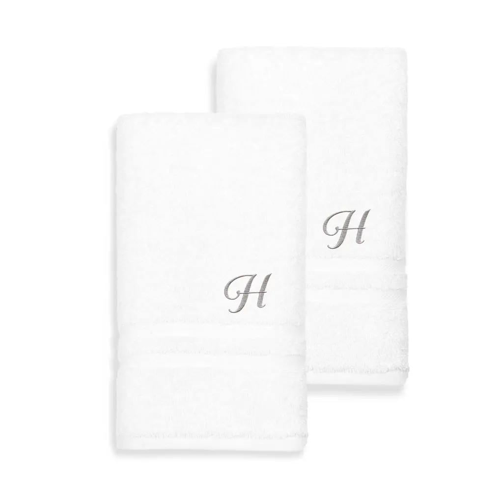 Mark your space in style with this set of monogrammed terry hand towels. This pair of towels features the elegant script initial of your choice for an upscale look in your bathroom. Soft, thick Turkish cotton construction makes the towels extra absorbent for quick and efficient hand-drying without pilling or shedding.Set includes 2 hand towelsSoft, thick and very absorbentLong-lasting towels designed for heavy useBecome softer with each washWill not pill or shedMaterials: 100 percent Turkish cottonCare instructions: Machine washableMade in TurkeyProduct Features: Monogrammed, Eco-FriendlyPattern: Solid Color, EmbroideredCare Instruction: Machine WashTowel: Hand Towels, Towel Sets, Decorative, Guest TowelsColor: White, GreyHand Towel: 16 inches wide x 30 inches long