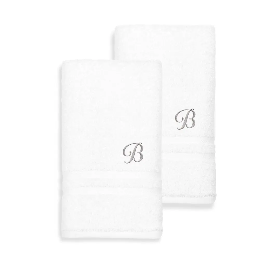 Mark your space in style with this set of monogrammed terry hand towels. This pair of towels features the elegant script initial of your choice for an upscale look in your bathroom. Soft, thick Turkish cotton construction makes the towels extra absorbent for quick and efficient hand-drying without pilling or shedding.Set includes 2 hand towelsSoft, thick and very absorbentLong-lasting towels designed for heavy useBecome softer with each washWill not pill or shedMaterials: 100 percent Turkish cottonCare instructions: Machine washableMade in TurkeyProduct Features: Monogrammed, Eco-FriendlyPattern: Solid Color, EmbroideredCare Instruction: Machine WashTowel: Hand Towels, Towel Sets, Decorative, Guest TowelsColor: White, GreyHand Towel: 16 inches wide x 30 inches long