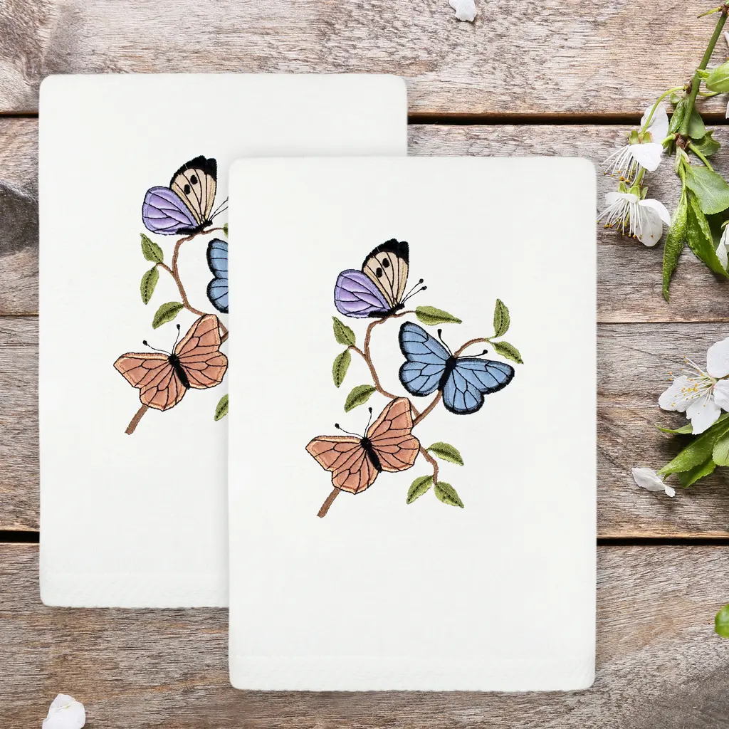 Bring a natural Spring spirit to your decorations with elegant, embroidered hand towels for your guest bath. These Spring Butterflies towels feature three lustrous applique butterflies perched peacefully on a branch. These special & luxurious towels are manufactured with more cotton per square inch for maximum softness and absorbency. The Spring Butterflies towels will add a graceful mood to your home decor and make a great gift.Embroidered Butterflies Design100% Genuine Turkish CottonMachine wash cold, no bleach, line dry or dry cleanAvailable in color options white or sandSet includes 2 embroidered hand towels (16" x 30")Made in TurkeyProudly Embellished in USA
