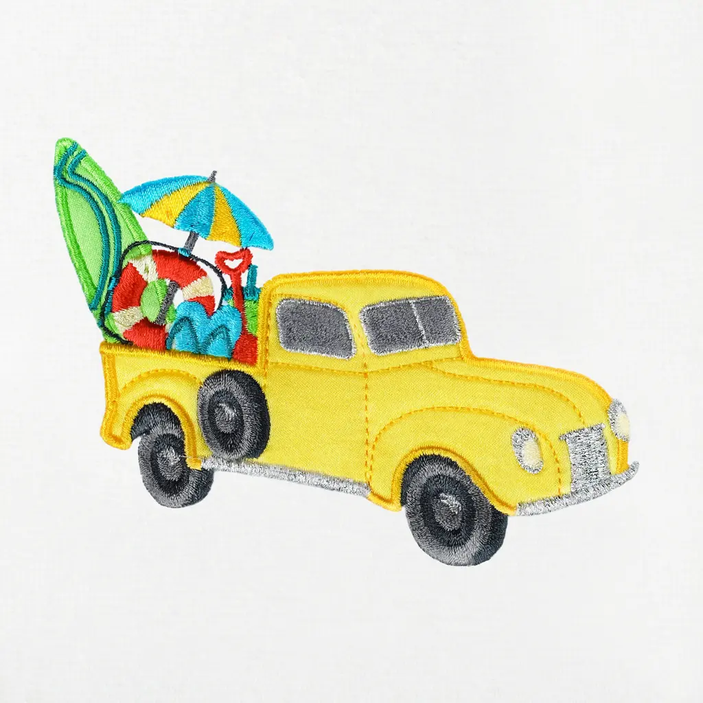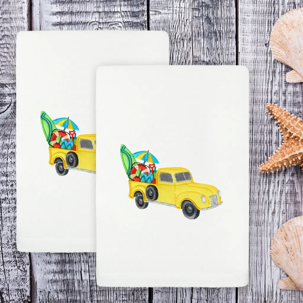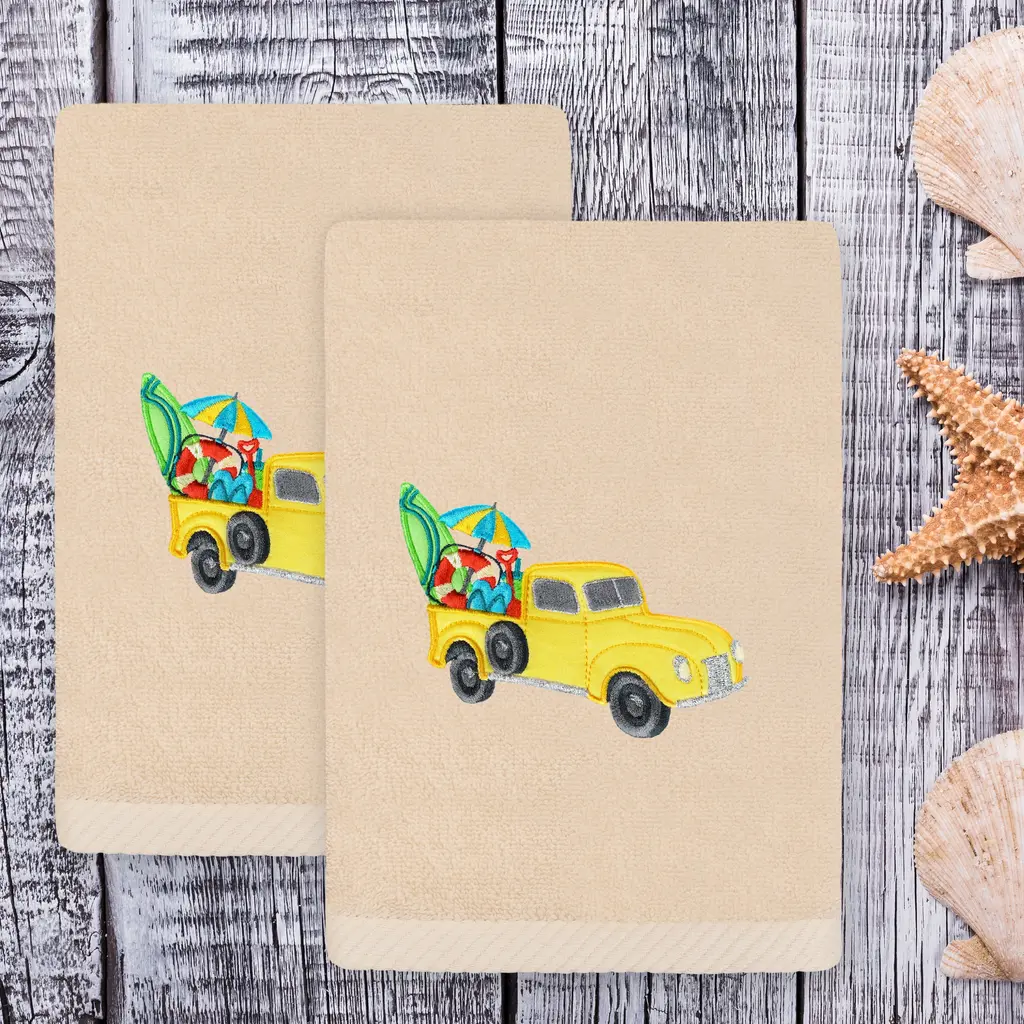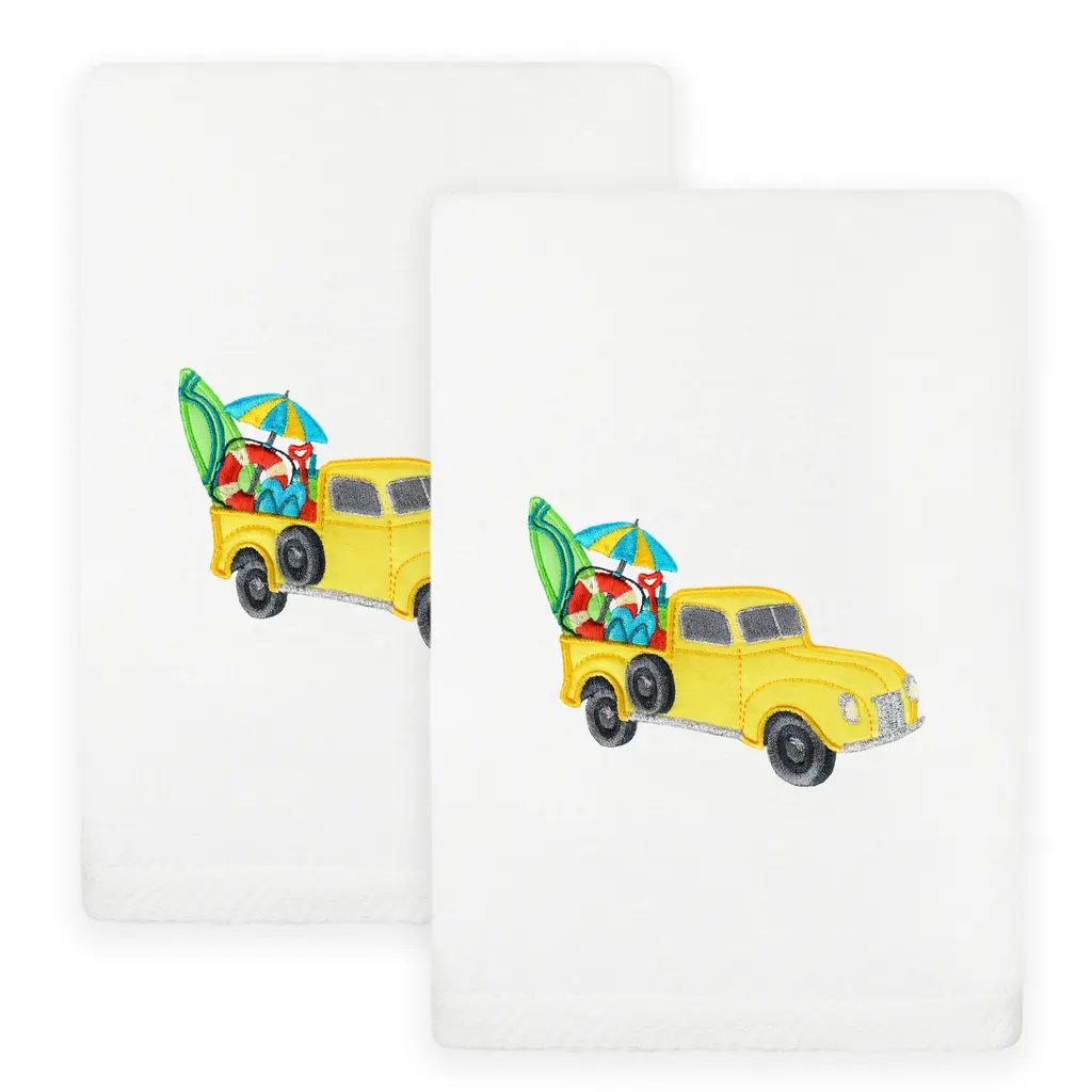 Bring a joyful summer spirit to your decorations with colorful, embroidered hand towels for your guest bath. These SUMMER TRUCK towels feature a lustrous antique truck with intricately detailed seasonal equipment in the back. These special & luxurious summer towels are made of the finest 100% Turkish cotton for maximum softness and absorbency. The SUMMER TRUCK towels will add a nostalgic mood to your festivities and make a great gift! Embroidered Truck Design100% Genuine Turkish CottonMachine wash cold, no bleach, line dry or dry clean.Available in color options white or sandSet includes 2 embroidered hand towels (16" x 30")Made in TurkeyProudly Embellished in USA