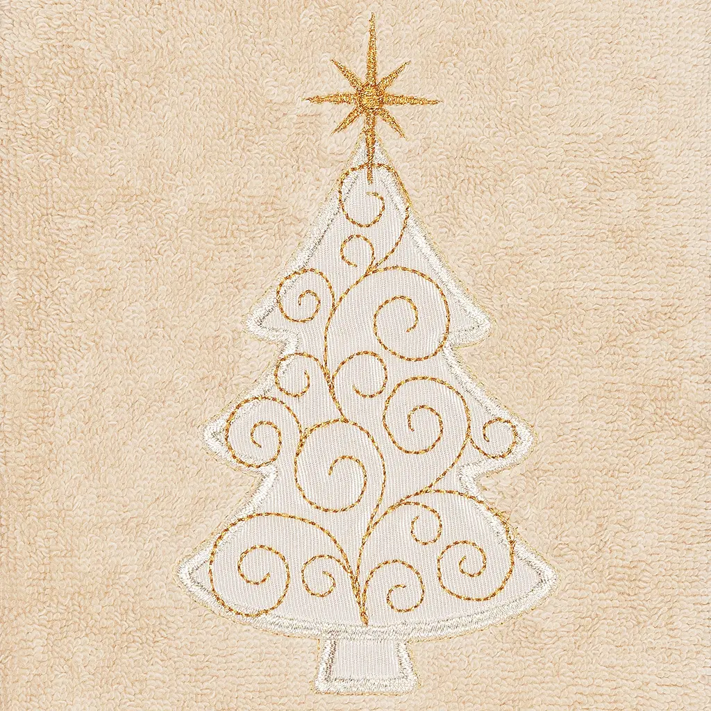 These authentic hotel and spa hand towels are made from plush, high end Turkish cotton for supreme absorbency and durability. These beautiful beige towels are embroidered with a gold scroll decorated Christmas tree topped by a gold star that is sure to bring holiday spirit to your home.Includes: Two (2) hand towels100-percent soft and absorbent Turkish cottonThese luxurious towels are produced in a state of the art green factory in Turkey which runs on 100-percent solar energyMade in TurkeyDimensions: Hand towel - 16 inches wide x 30 inches long