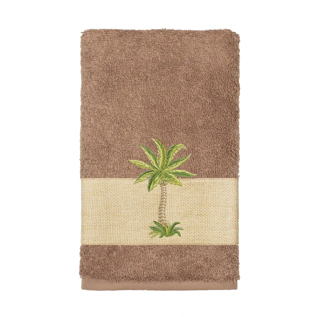 This authentic hotel and spa hand towel is made from plush, high end Turkish cotton for supreme absorbency and durability. This beautiful latte brown towel is embellished with a palm tree applique and embroidery design with a textured woven border to add that special touch to your bathroom.Includes: One (1) hand towel100-percent soft and absorbent Turkish cottonEmbellished with a design in a combination of applique and embroideryThis luxurious towel is produced in a state of the art green factory in Turkey which runs on 100-percent solar energyCare instructions: Machine wash and dryMade in TurkeyDimensions: Hand towel - 16 inches wide x 30 inches long