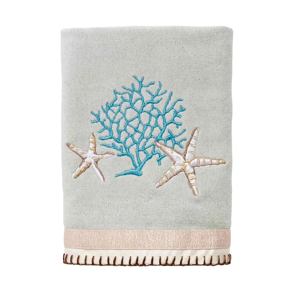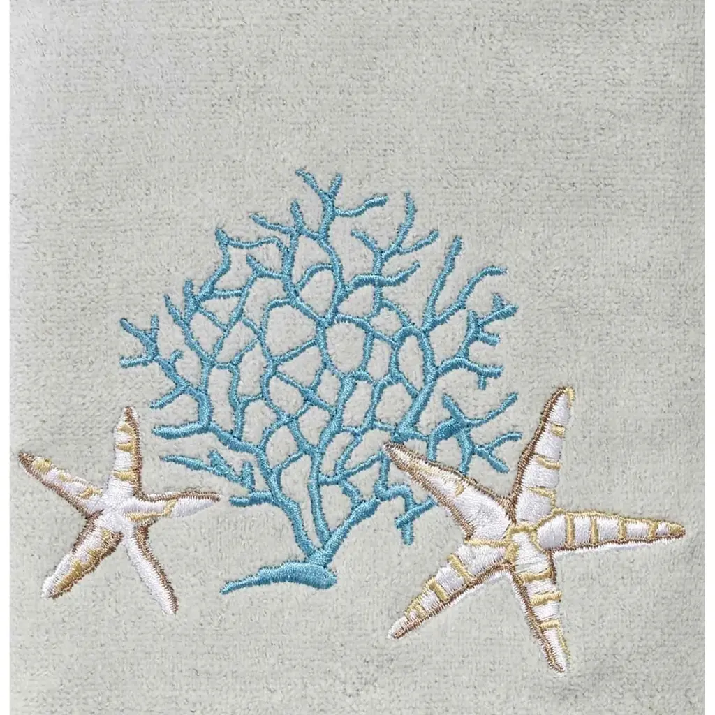 The Avanti Beachcomber Hand Towel features a beautifully embroidered seascape with starfish and coral in shades of ivory, white, aqua and teal. Finished with a coordinating fabric border with whip-stitch detail. 16" x 30" seafoam velour 100% cotton (excl of embellishment) towel.