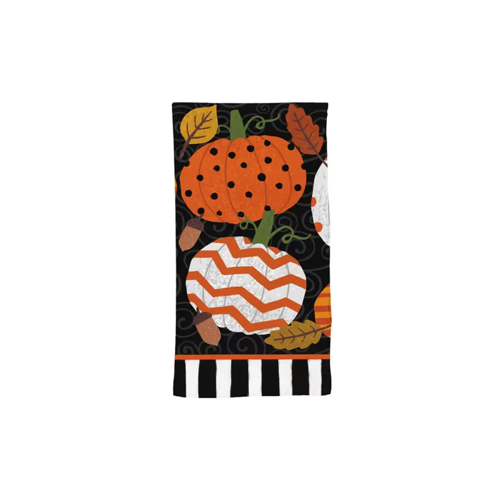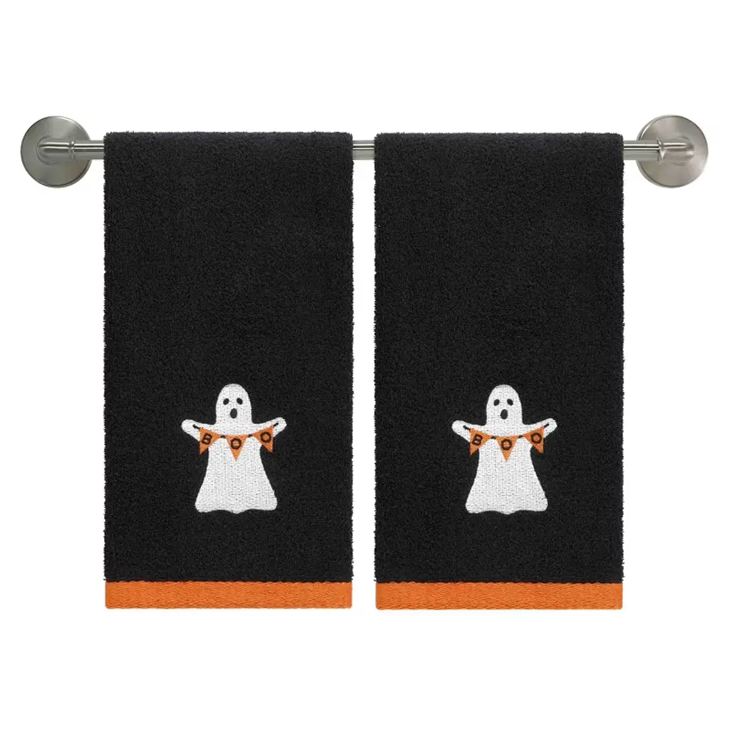 The Avanti Ghost Boo Halloween 2-Pack Embroidered Decorative Hand Towel Set features a white ghost holding an orange "BOO" banner. The black 100% cotton terry ground is finished with an orange polyester border. Set includes two 16" x 26" towels, machine washable.