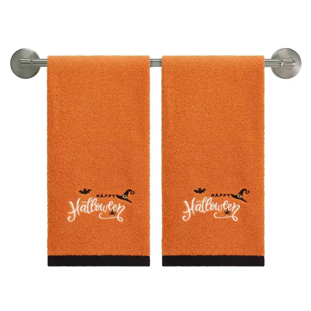 The Avanti Happy Halloween Icons 2-Pack Embroidered Decorative Hand Towel Set features "Happy Halloween" with a bat, witches' hat and spider. The orange 100% cotton terry towel is finished with a black polyester border. Set includes two 16" x 26" towels, machine washable.
