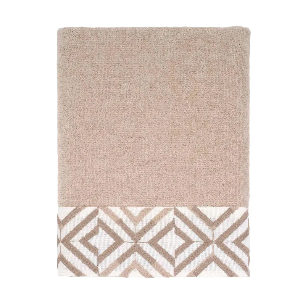 The Avanti Harlow Linen Hand Towel features offset rows of concentric diamonds intricately embroidered in light and medium brown on a 100% polyester ivory cloth. The 16" x 30" linen velour towel is made of 100% cotton. Other colors and sizes available.