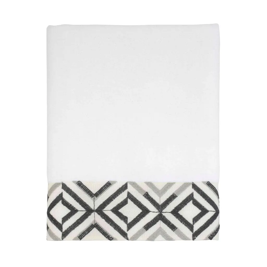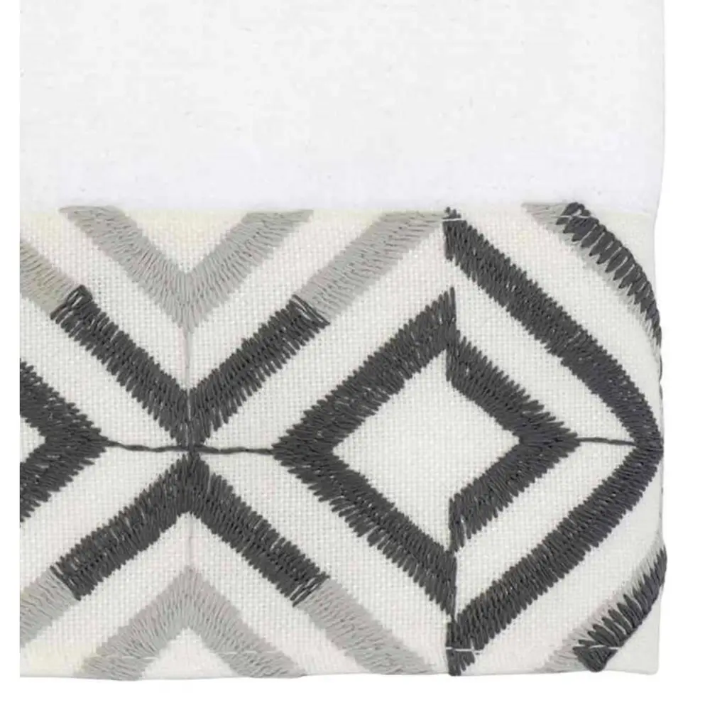 The Avanti Harlow White Hand Towel features offset rows of concentric diamonds intricately embroidered in light and dark grey on a 100% polyester white cloth. The 16" x 30" white velour towel is made of 100% cotton. Other colors and sizes available.