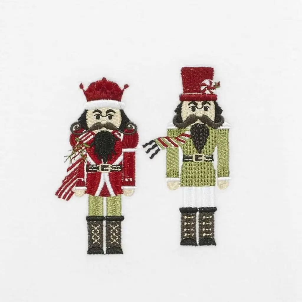 The Avanti Peppermint Nutcracker Decorative Embroidered Hand Towel 2-Pack features 2 festively dressed nutcrackers in shades of red and green on a white velour ground. The 16" x 28" 100% cotton towels are finished with a white and red vertical striped polyester border. Matching pieces available.