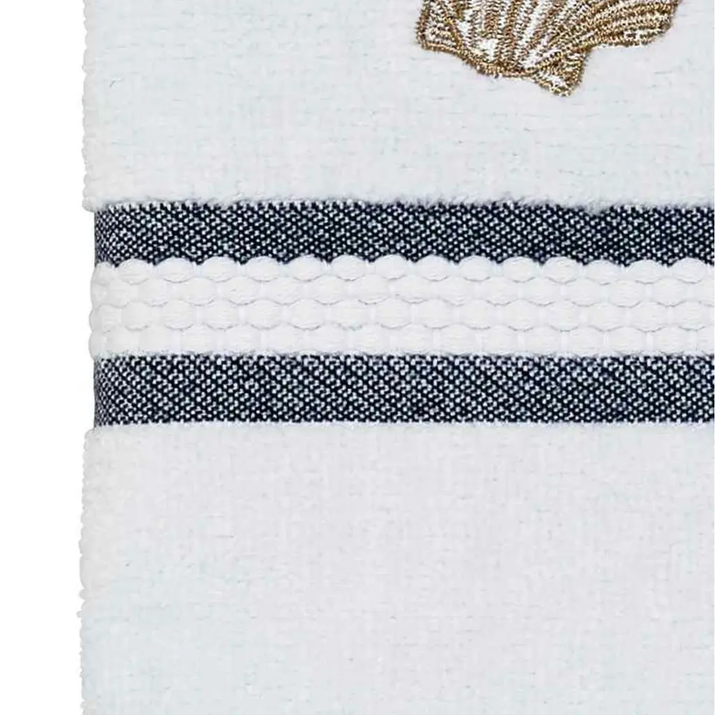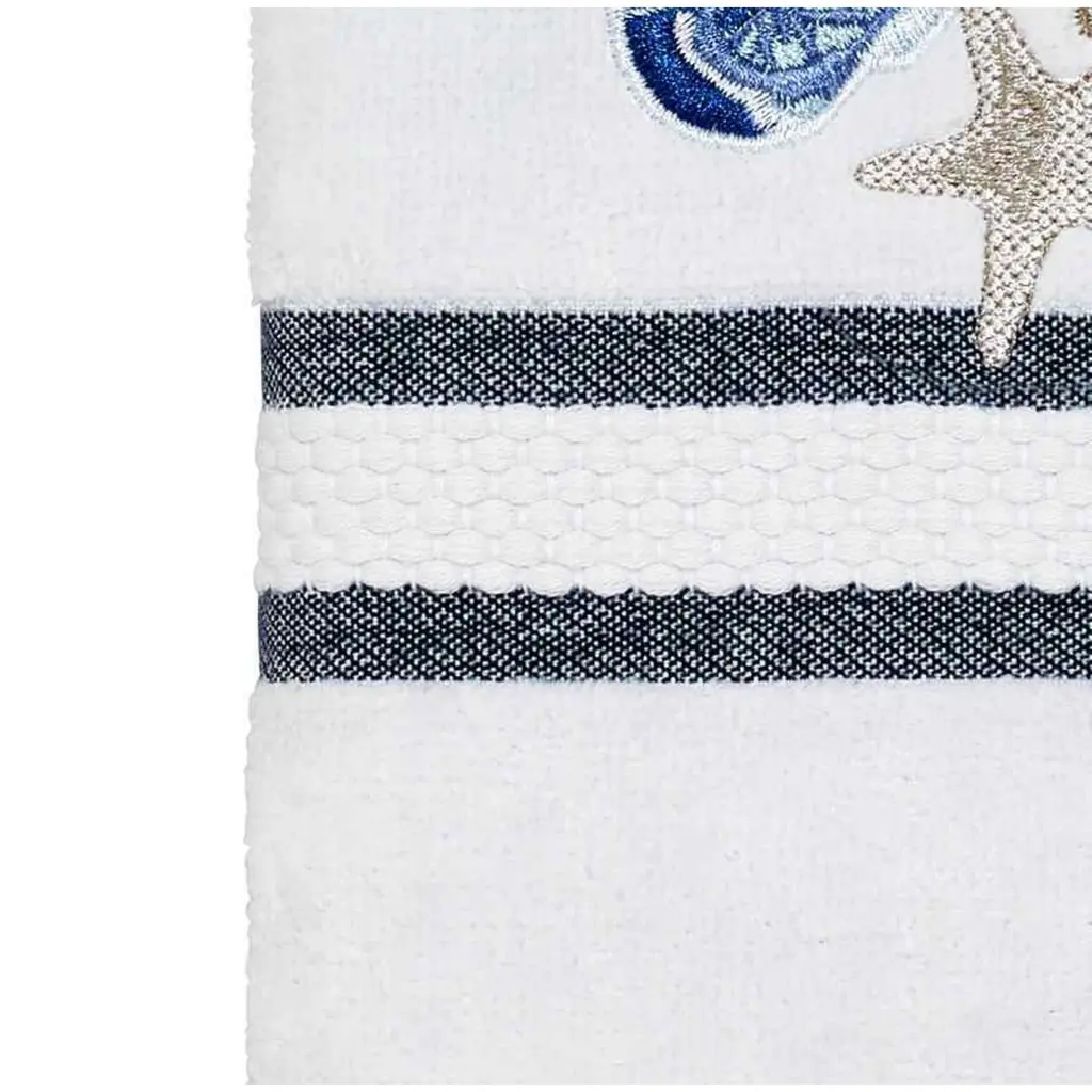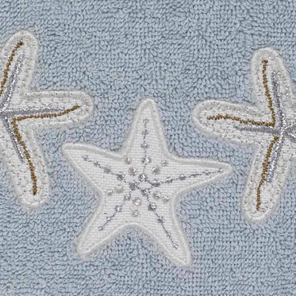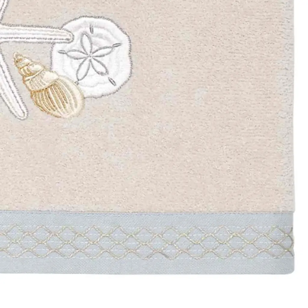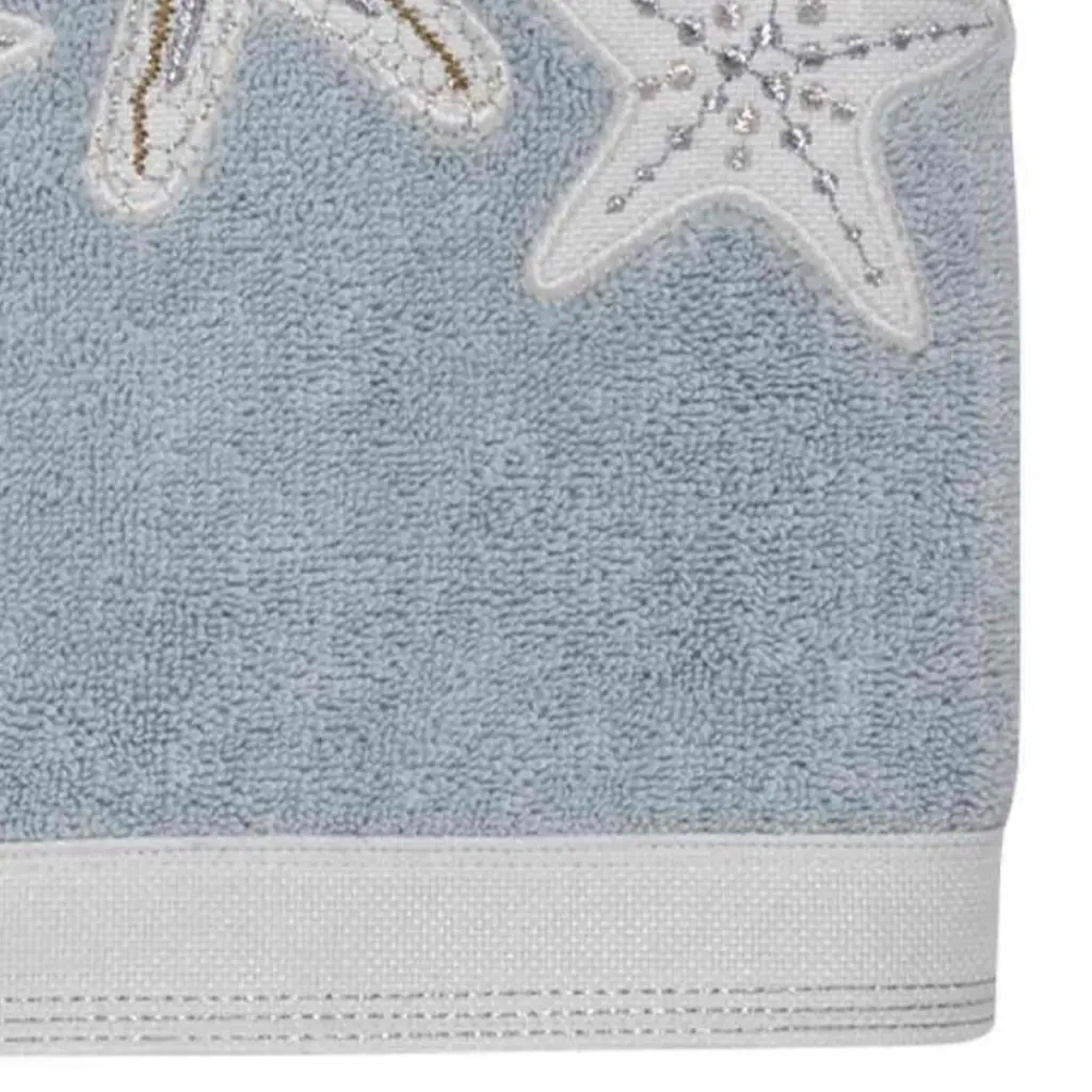 The Avanti Sequin Shells Decorative Embellished Hand Towel features embroidered starfish appliqued on off-white fabric with blue, beige and silver accents. Finished with a coordinating off-white fabric trim. 16" x 28" 100% cotton mineral terry towel is soft, plush and absorbent.