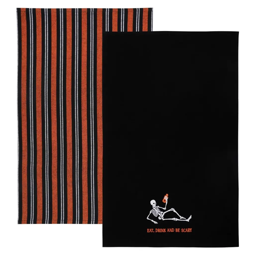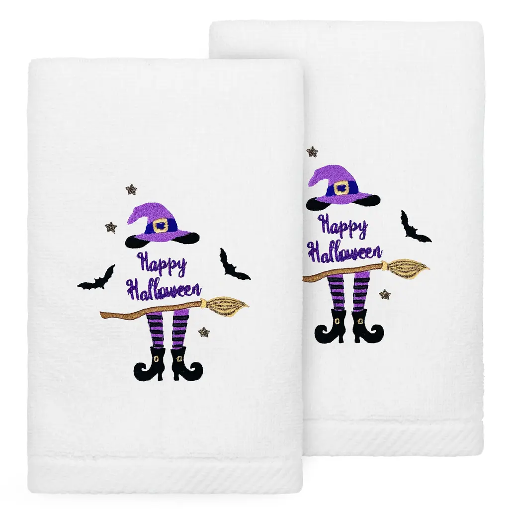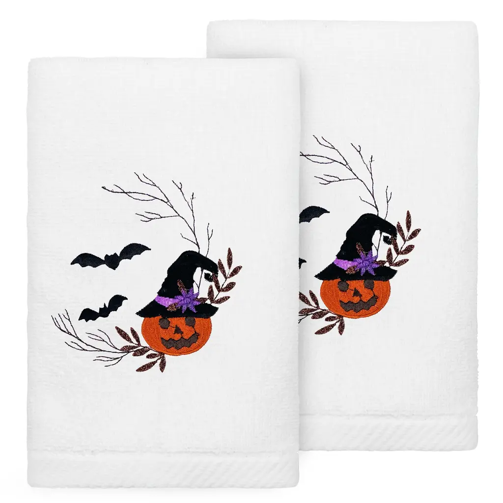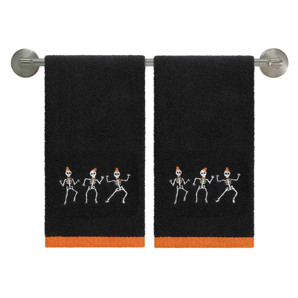 The Avanti Skeletons Halloween 2-Pack Embroidered Decorative Hand Towel Set features 3 happy, dancing skeletons with orange top hats. The black 100% cotton terry ground is finished with an orange polyester border. Set includes two 16" x 26" towels, machine washable.