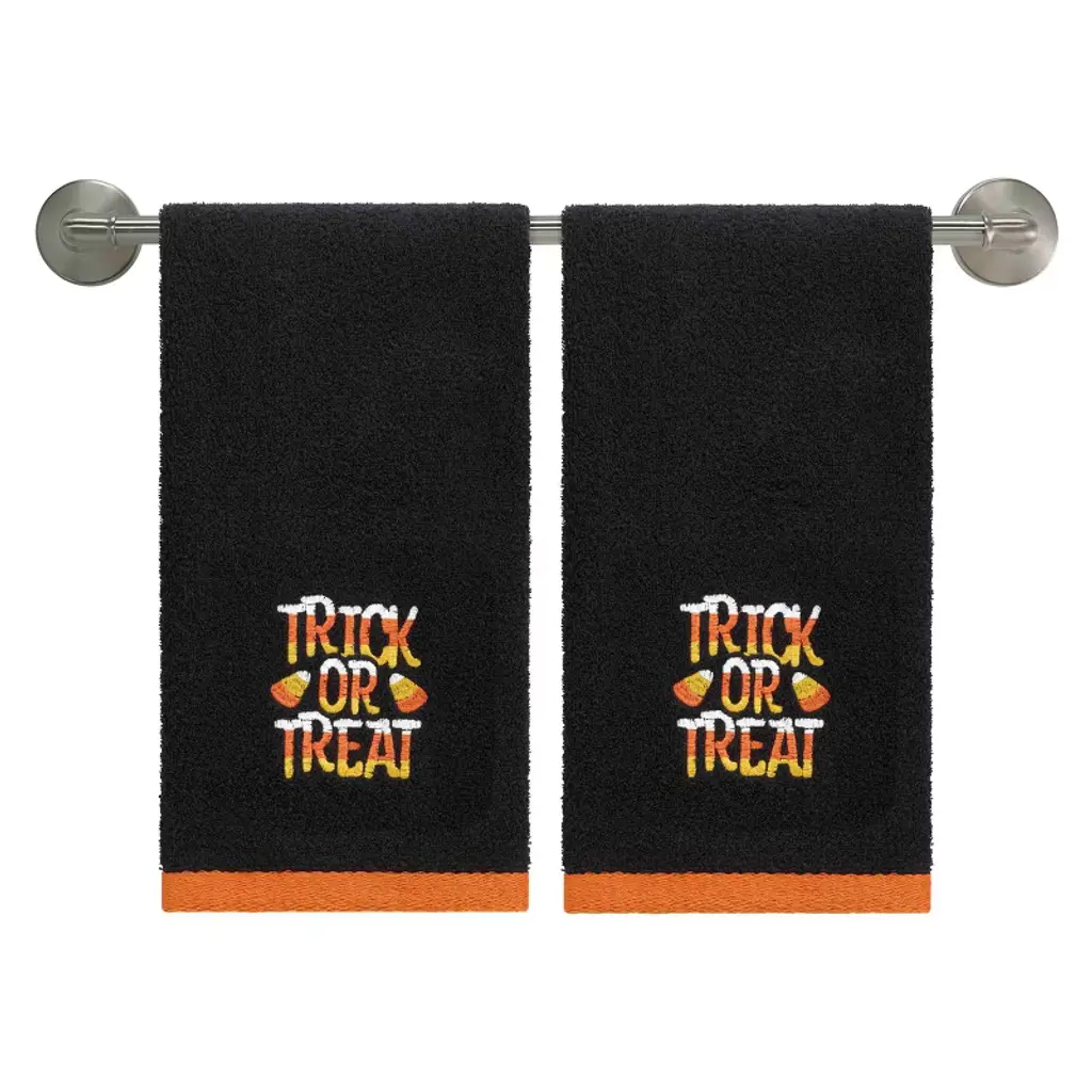 The Avanti Trick or Treat Halloween 2-Pack Embroidered Decorative Hand Towel Set features 2 candy corns and "Trick or Treat" in candy corn colors. The black 100% cotton terry ground is finished with an orange polyester border. Set includes two 16" x 26" towels, machine washable.