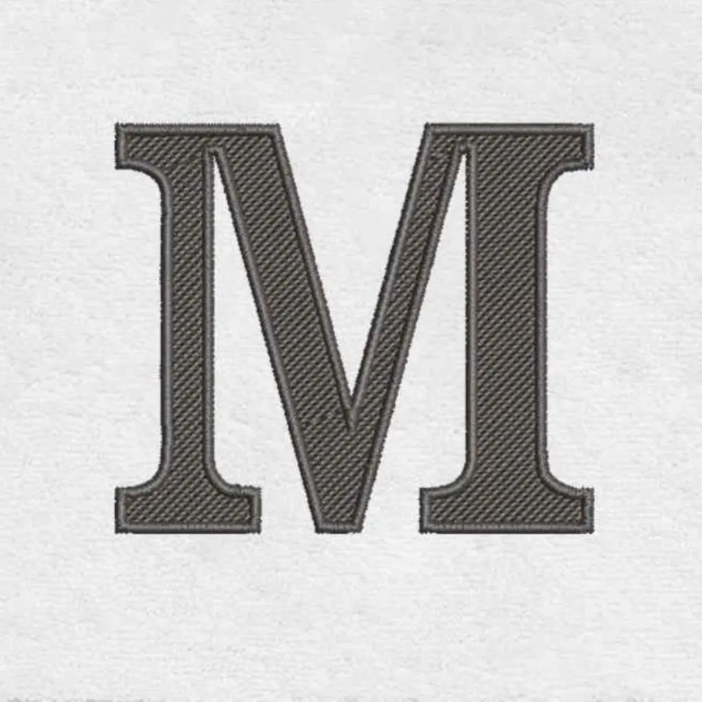The Avanti White/Grey "M" Block Monogram Hand Towel features an embroidered dark grey capital "M" in a modern block font. The 16" x 28" ringspun combed 100% cotton towel features a flat decorative border with terry above and below. Other letters and sizes available.