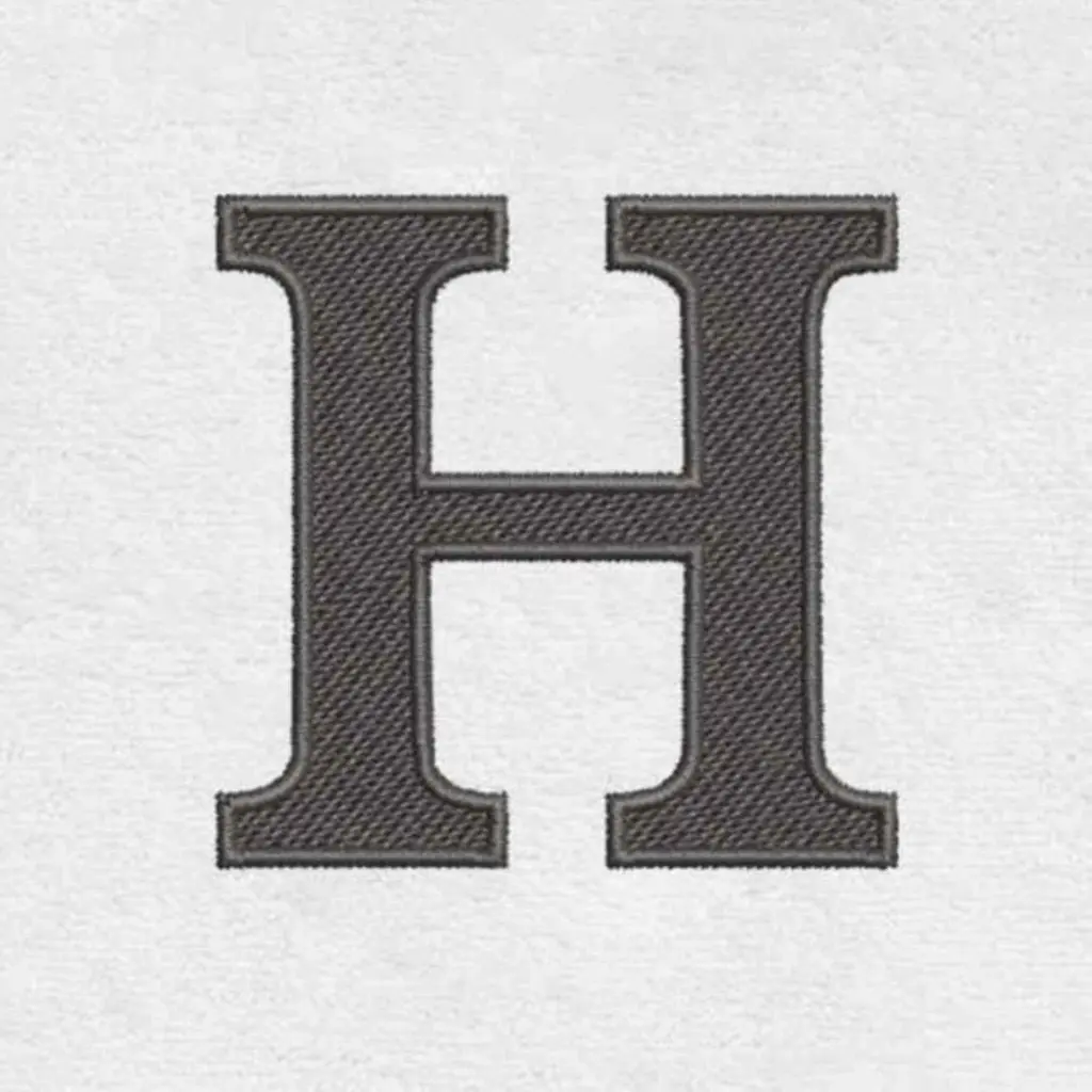 The Avanti White/Grey "H" Block Monogram Hand Towel features an embroidered dark grey capital "H" in a modern block font. The 16" x 28" ringspun combed 100% cotton towel features a flat decorative border with terry above and below. Other letters and sizes available.
