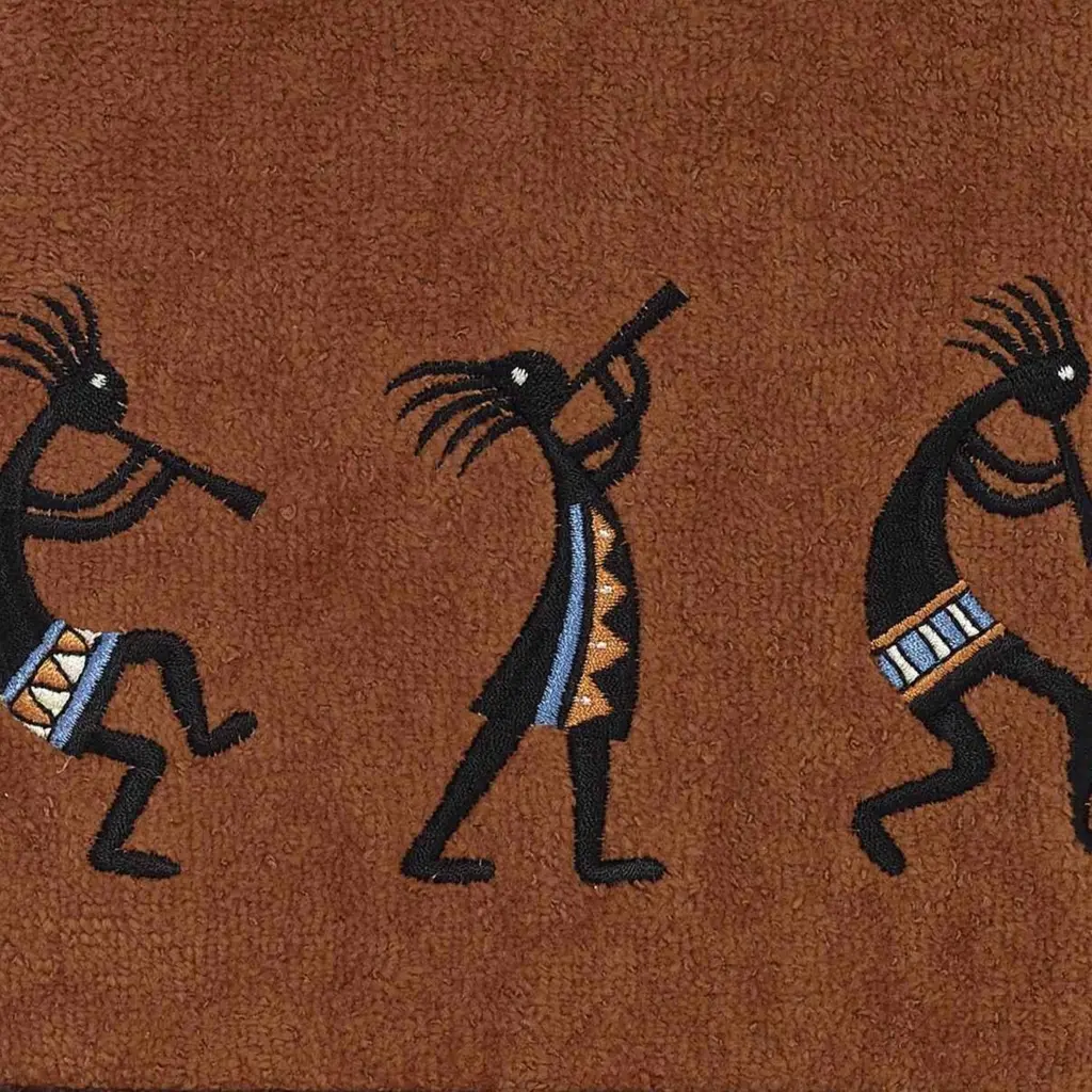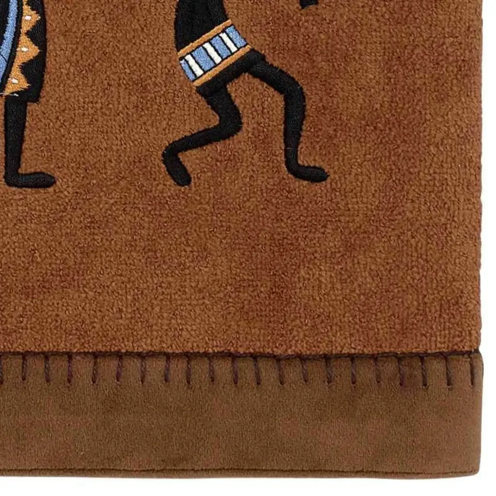 The Avanti Zuni Decorative Hand Towel features 3 embroidered flute-playing Kokopellis in brown with orange, white and aqua accents. The design is finished with a coordinating brown suede fabric with whipstitch. Cotton towel is 16" x 30" 100% cotton velour. Bath and fingertip also available.