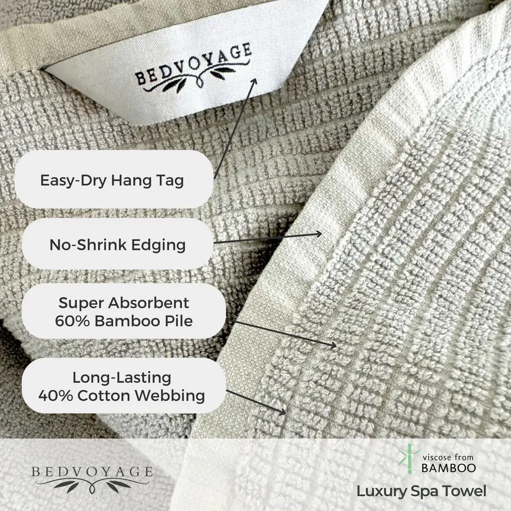 Ultra plush & soft bath towel set: Spa quality 6pc Towels set made of Viscose derived from Bamboo and Cotton luxury towel sets. The Bathroom Set includes 2 Bath Towels, 2 Hand Towels and 2 Washcloths. The 60% Viscose from Bamboo pile is super absorbent, and the 40% Cotton webbing creates long-lasting bathroom towels. 30x54 Bath, 16x28 Hand Towels, 12x12 Washcloth, with hang tags for easy drying. No-shrink edging means these luxury towels will keep their shape for years. 650GSM SUPER ABSORBENT: Our spa bath towel offer cloud-like softness, are moisture wicking and super absorbent so you'll dry off quickly. They look beautiful hanging or displayed in any bathroom. GIVE THE GIFT OF COMFORT: a plush luxury bath towel with spa-like qualities make the perfect gift for housewarming, weddings, birthdays, and for anyone that appreciates quality and comfort. These quick dry bath towels make wonderful luxury guest towels, fit for any bathroom! GENTLE TO SENSITIVE SKIN: BedVoyage crafts our bath towels from skin-friendly Viscose from Bamboo, which is incredibly gentle to sensitive skin. The natural odor-resistant qualities will keep your bath towels fresh for days. They can be reused and hung to dry for the next use, with never any odor. Our bath towels come with an OEKO-TEX STANDARD 100 certification. WOMAN-OWNED USA BRAND: BedVoyage is a woman-owned small business based in WA state, that takes pride in offering high quality products and great customer service. We stand behind our products! CERTIFICATIONS: Oeko-Tex Standard 100 certified: Tested for harmful substances. Green America Business certified, SMETA Social Responsibility audit, NWBOC Women Owned certified EASY CARE: machine wash first using warm water and gentle liquid detergent, dry on medium. Not recommended: bleach, fabric softener, dryer sheets or wool balls