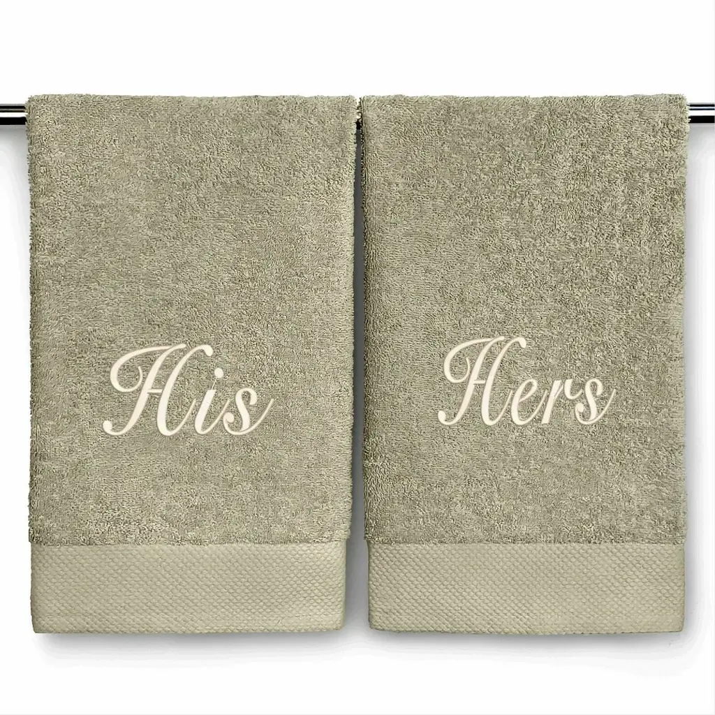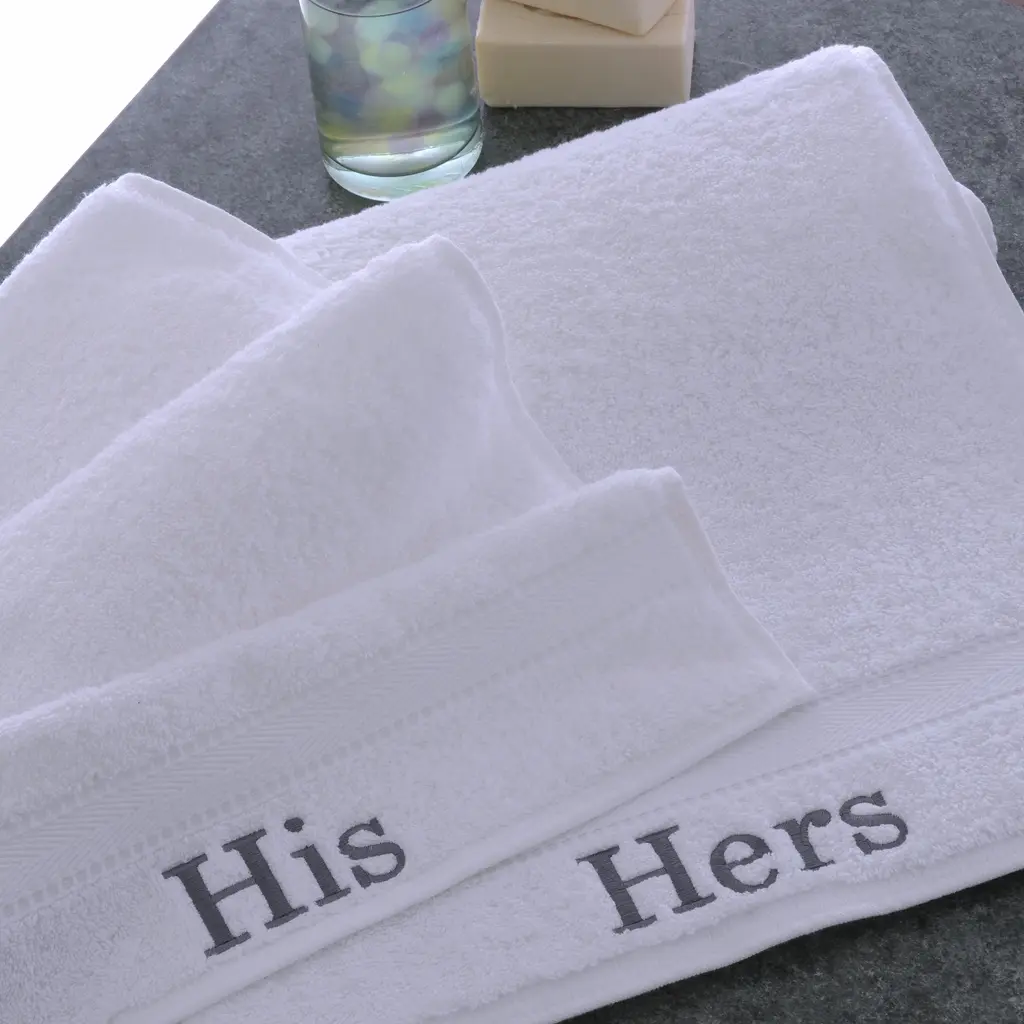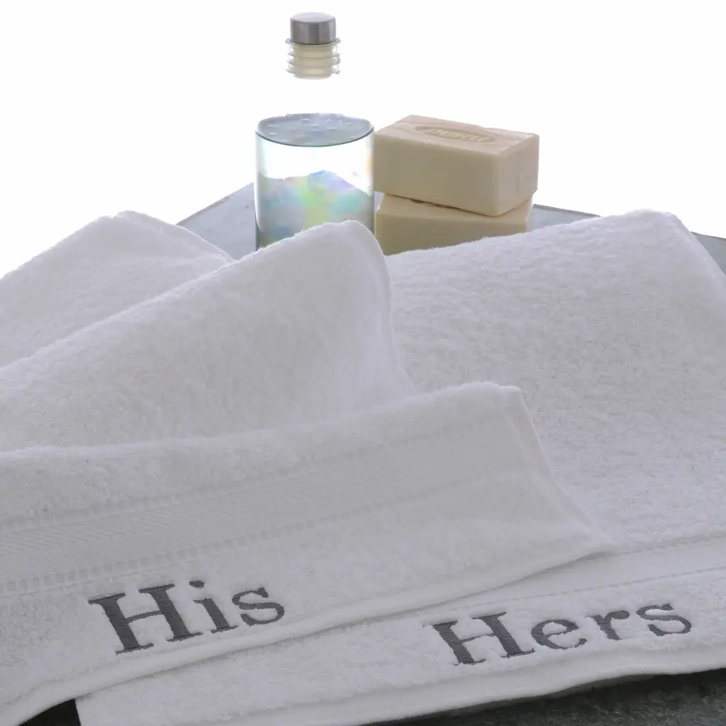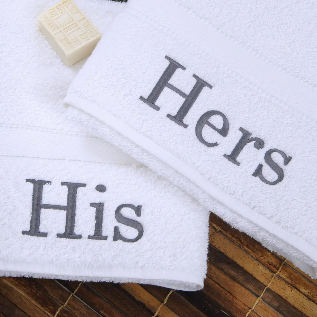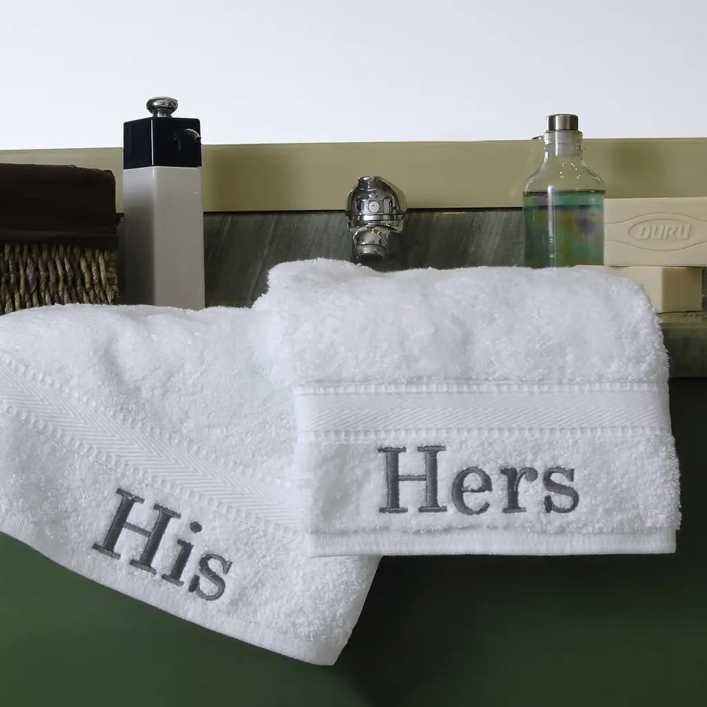 These authentic extra plush set of 2 hand towels are made from high end Turkish cotton and monogrammed in charcoal grey thread with His and Hers. The 750 gram hand towels are made for five-star luxury hotels and become softer and more absorbent with every wash. Copper Grove has a great collection of bathroom decor.FeaturesTwo hand towelsSolid white pattern with white herringbone trimTurkish cotton Plush looped terrycloth construction Color is white with charcoal grey monogram100-percent Turkish cotton750 gramMachine washableMade in TurkeyDimensions: 16 inches x 30 inches