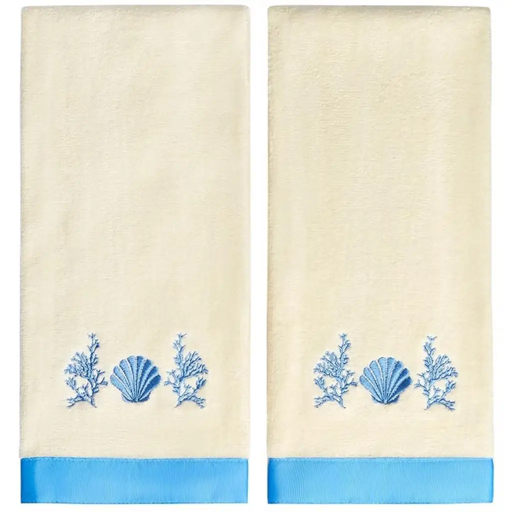 Bring the tranquility of the coast to your bathroom with the Coral Patch Bath Collection. This delightful set of two hand towels showcases beautifully embroidered scallop shells, infusing your space with a touch of seaside elegance. Crafted from soft, absorbent cotton, each towel measures 26" x 16", offering both comfort and practicality. Easy to care for, these towels are machine washable and can be tumble dried, ensuring they stay fresh and vibrant. Perfect for adding a coastal flair, the Coral Patch Bath Collection is an ideal choice for transforming your bathroom into a serene retreat.