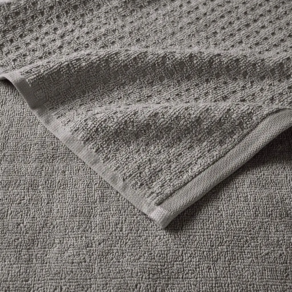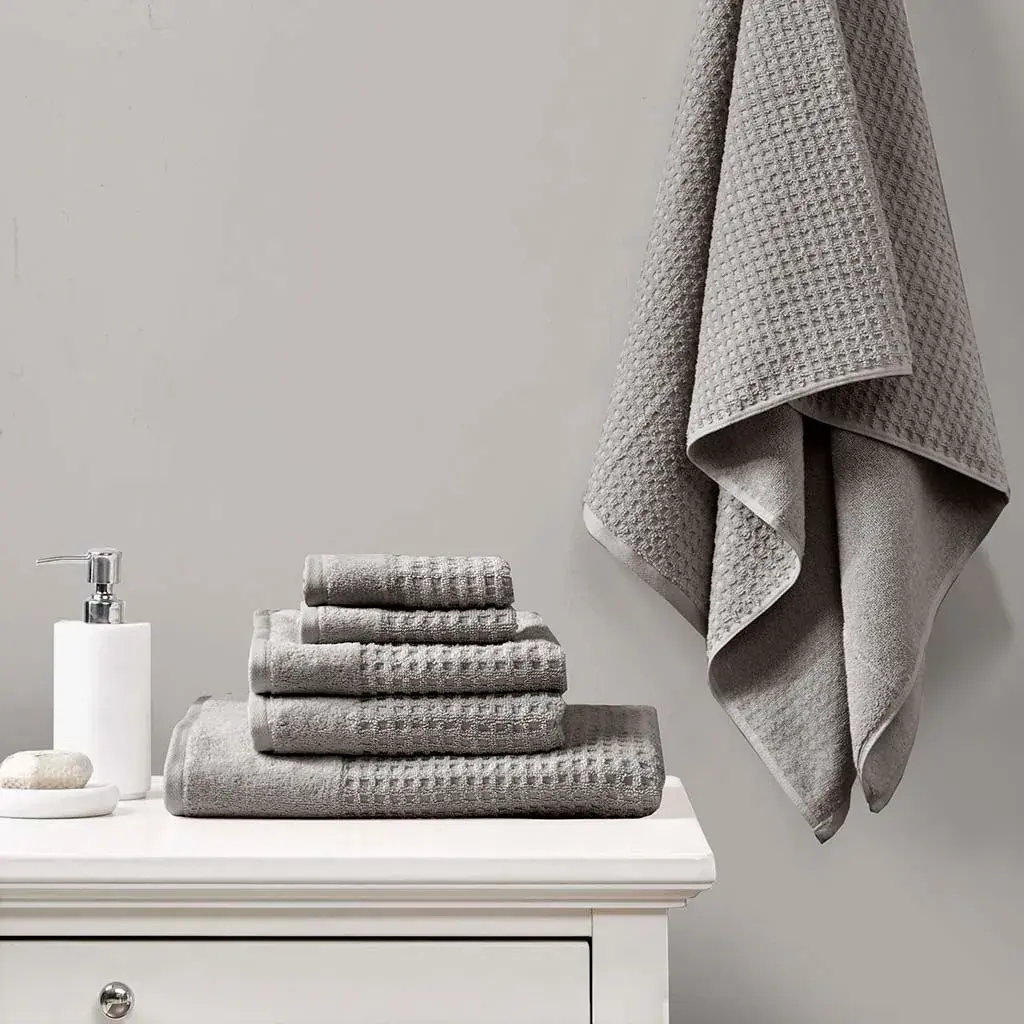 Our Madison Park Spa Waffle Cotton Towel 6 Piece Set provides the perfect textured update to your bathroom decor. This 100% cotton towel set features an all-over waffle combed jacquard design for a rich texture, while the velour dobby cuff adds a stylish contrast touch for an updated look and feel. The 600gsm weight makes each towel soft yet also lightweight and quick-drying, so it does not get weighed down from moisture throughout the day. These towels are also finished with a SILVADUR™ antimicrobial treatment providing built in freshness protection, inhibiting growth of odor causing bacteria, and keeping linen newer, longer. Active for multiple washes, this treatment delivers long-lasting durable odor protection performance. In addition, this towel set is also Made in Green by OEKO-TEX certified, meaning they do not include any harmful substances or chemicals while also using sustainable processes and socially responsible working conditions, for the best in quality comfort and wellness. Complete the look with coordinating Spa Rug and Spa Waffle Shower Curtains, available and sold separately. Set includes: 2 standard 28x54" bath towels, 2 standard 16x26" hand towels, and 2 standard 12x12" wash towels. 【Product Features】 [ Product Details ]See below2 Bath Towels:28"W x 54"L (2)2 Hand Towels:16"W x 26"L (2)2 Wash Towels:12"W x 12"L (2)Material:100% cotton 2/20 combed