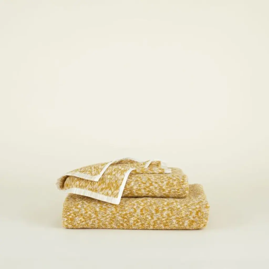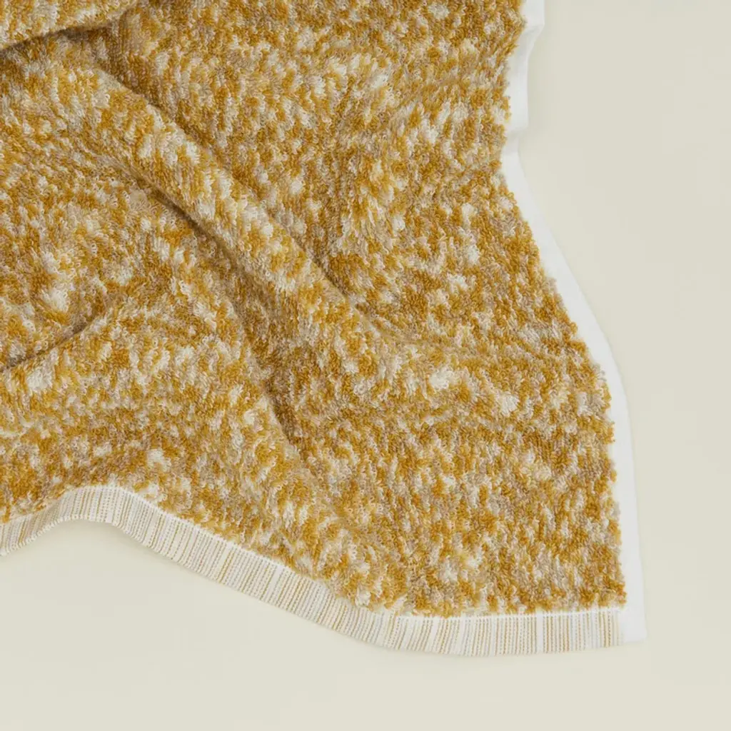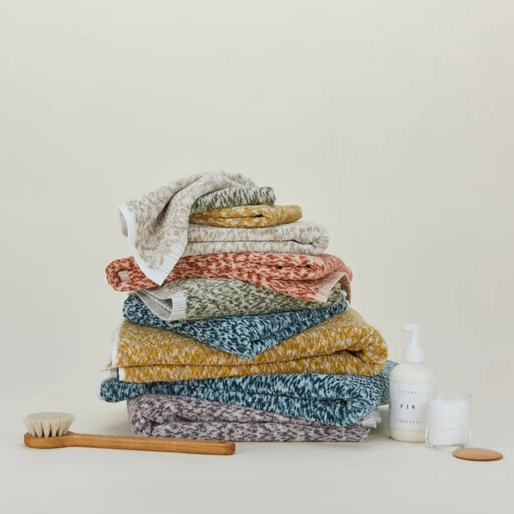 Super absorbent, 100% cotton. Oeko-Tex Standard 100 certified. 550 gsm weight. Cotton terry finished with a space dye technique (which blends 3 colors on a single thread). Cool melanged peacock patterning.