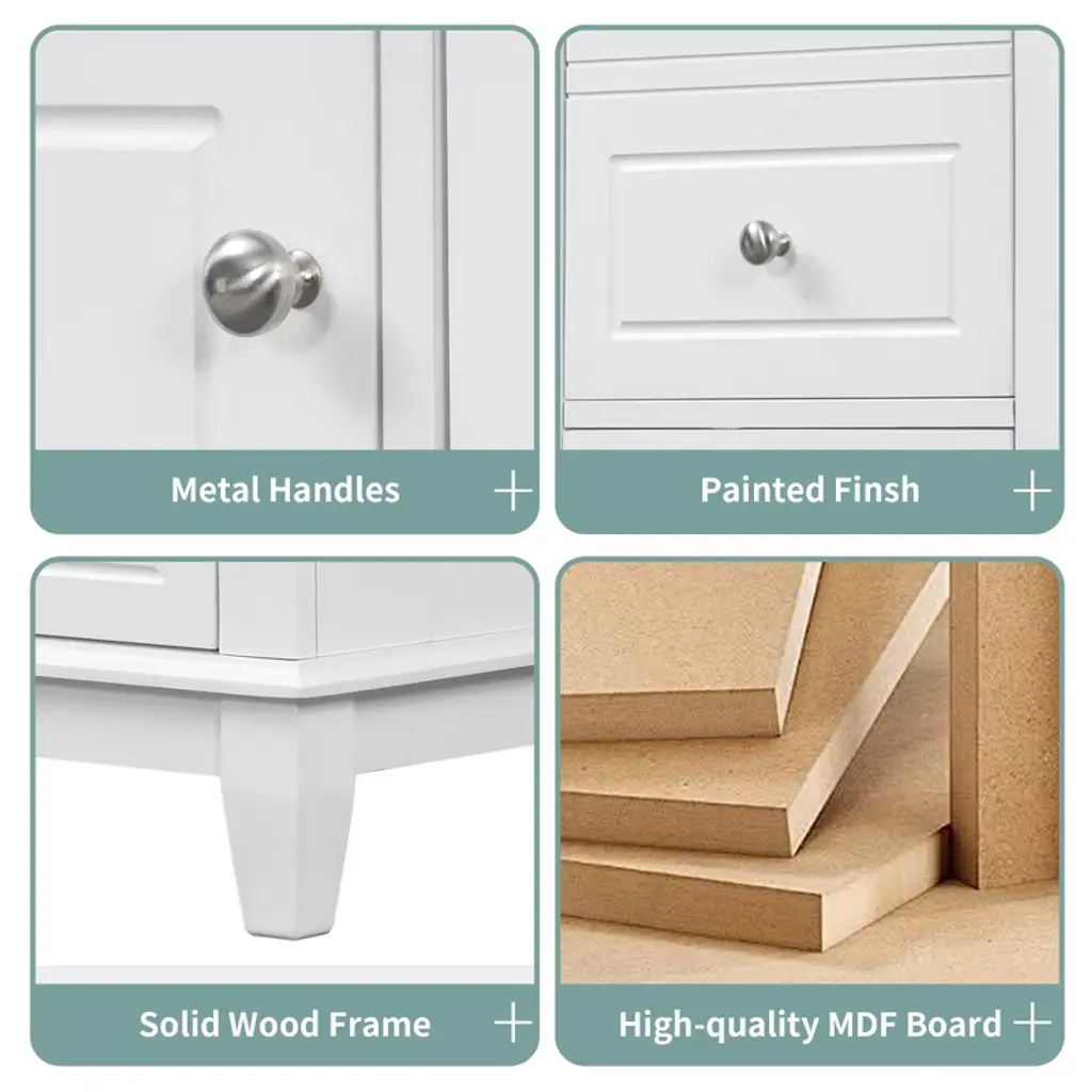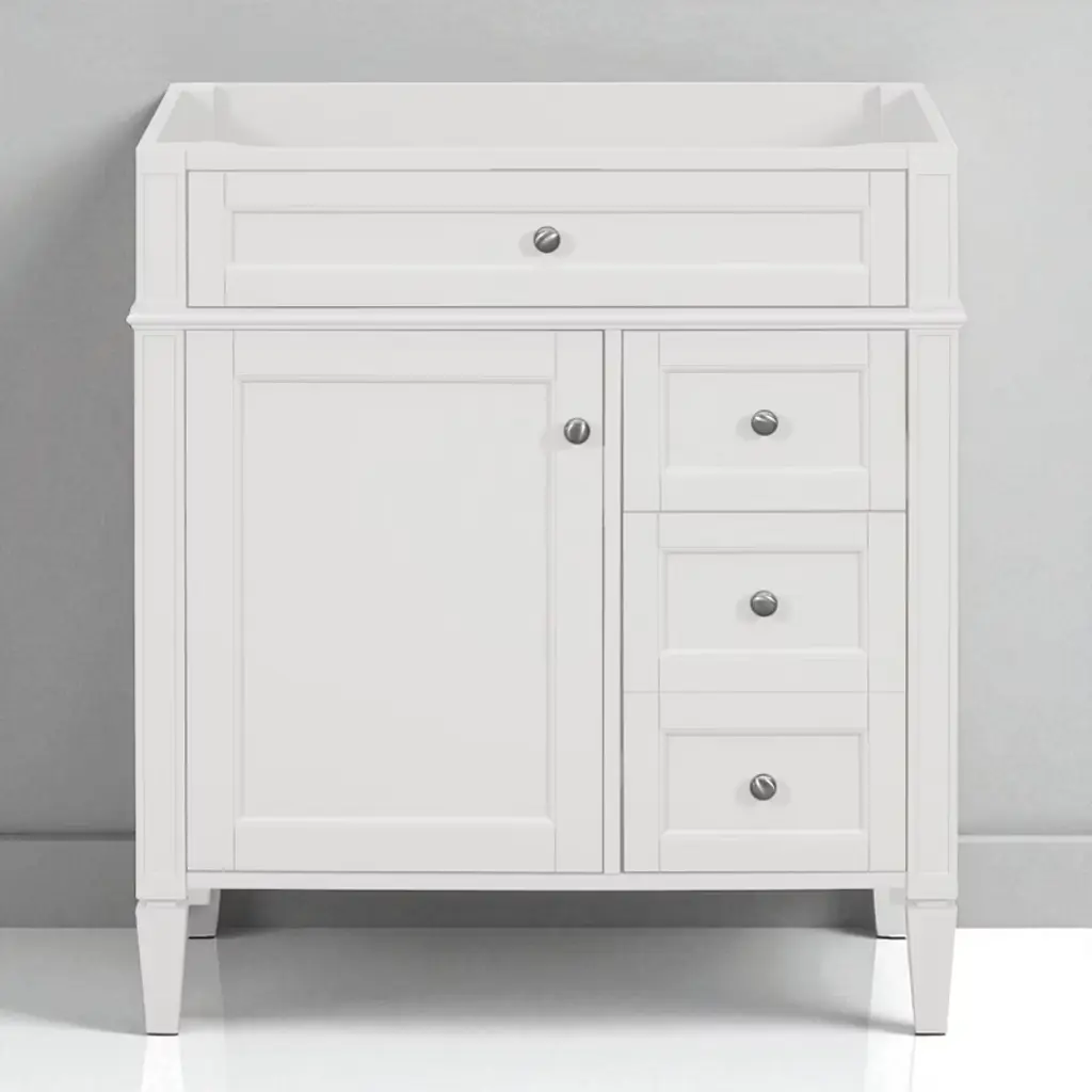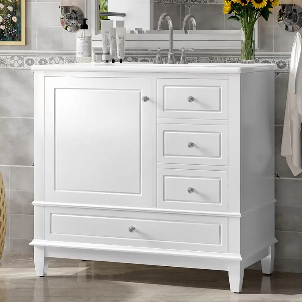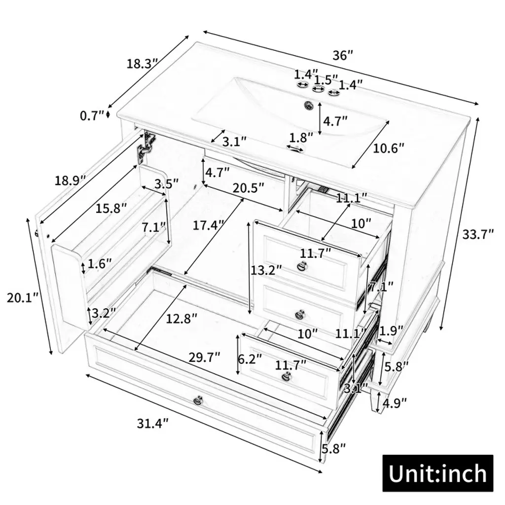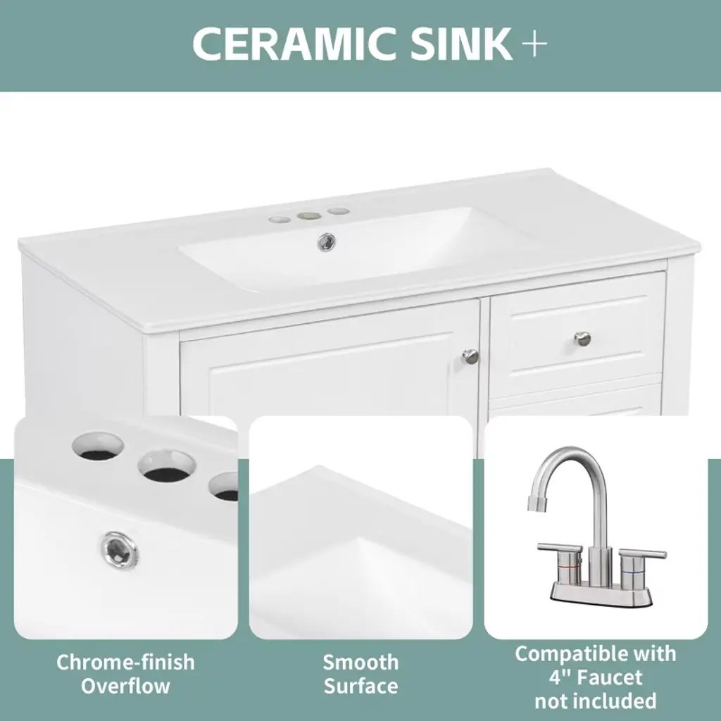 Elevate your bathroom with this 36-inch freestanding vanity, designed to offer both sophisticated style and everyday functionality. The cabinet features a white painted finish over a sturdy MDF structure, reinforced with a solid poplar wood frame and rubberwood legs for enhanced stability. The spacious ceramic sink top comes pre-drilled with 4-inch centerset faucet holes for easy installation (faucet not included). Inside, this vanity provides flexible storage solutions: three smooth-glide drawers in varying sizes and a side cabinet with integrated shelf racks — perfect for storing toiletries, hand towels, or other daily items. A wide bottom drawer offers additional space for larger accessories. With a modern profile and rear cutout for hassle-free plumbing, this vanity blends seamlessly into contemporary, transitional, or classic bathrooms. Premium Materials You Can Trust Built with MDF, solid wood, and a smooth ceramic basin, this vanity offers a sturdy structure and a clean, lasting finish—designed for everyday use. Functional Layout, Smart Storage This vanity combines drawers and a cabinet with built-in shelf racks to keep essentials organized and easily accessible—making the most of your space with a clean, efficient design. Seamless Ceramic Sink with Modern Flair The integrated ceramic basin offers a smooth, easy-to-clean surface with a sleek, modern profile. Its seamless design minimizes water buildup and pairs perfectly with a 4-inch faucet for a refined and functional finish. Easy Rear Access for Installation The open-back design simplifies plumbing installation by allowing quick access to water lines and drainage, making setup more convenient and efficient for professionals and DIYers alike.