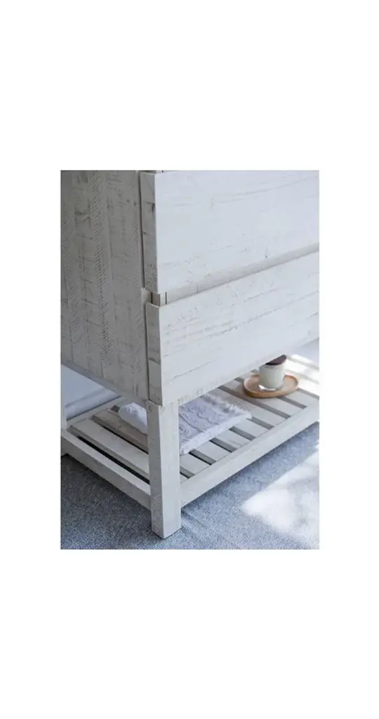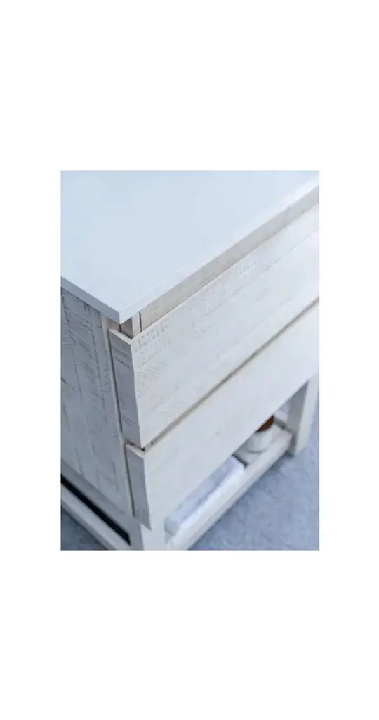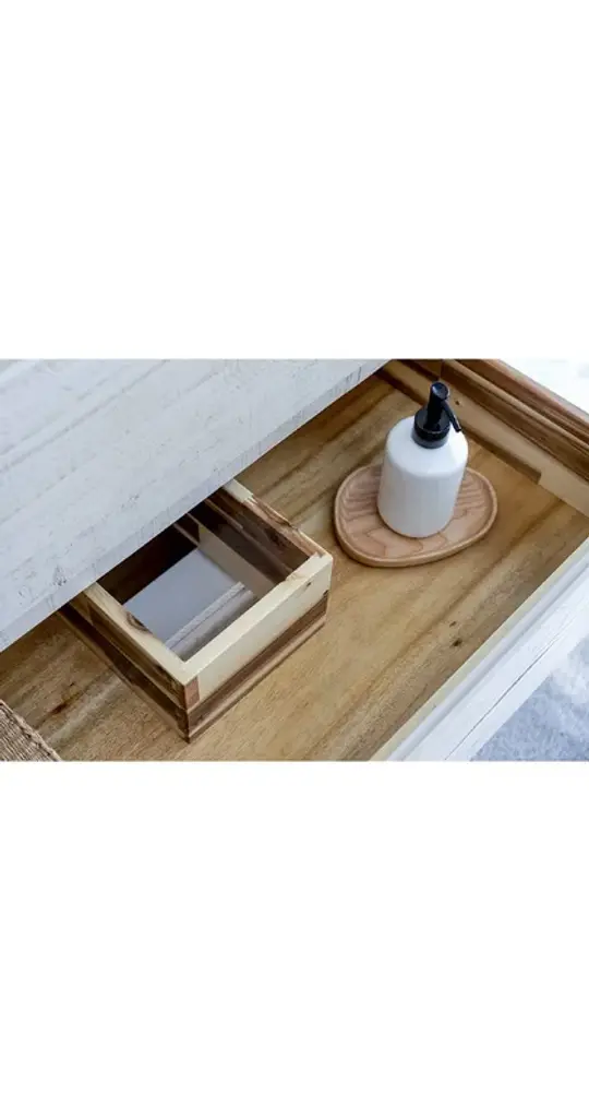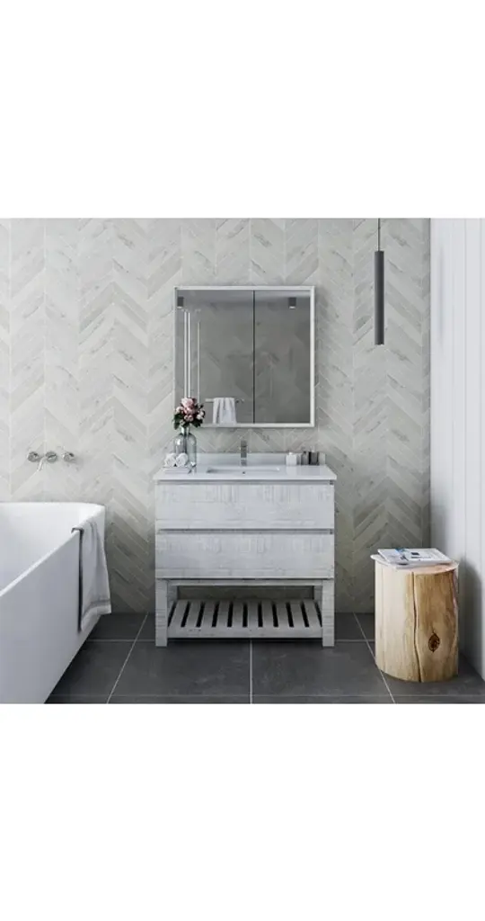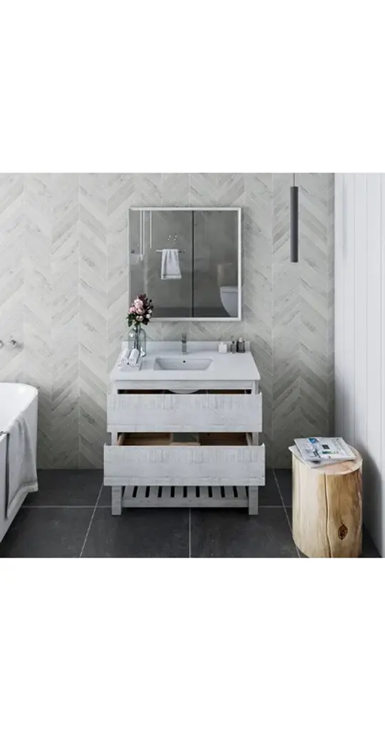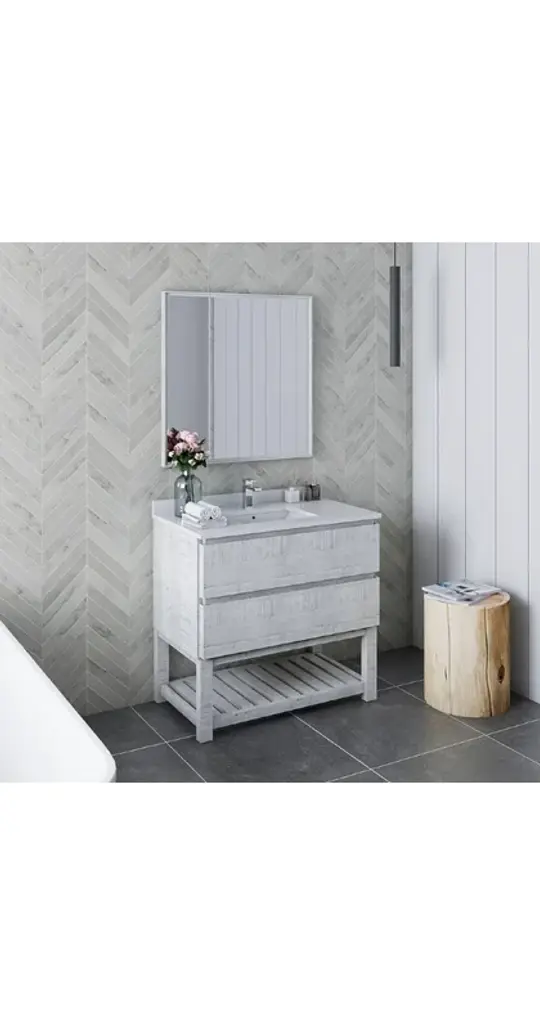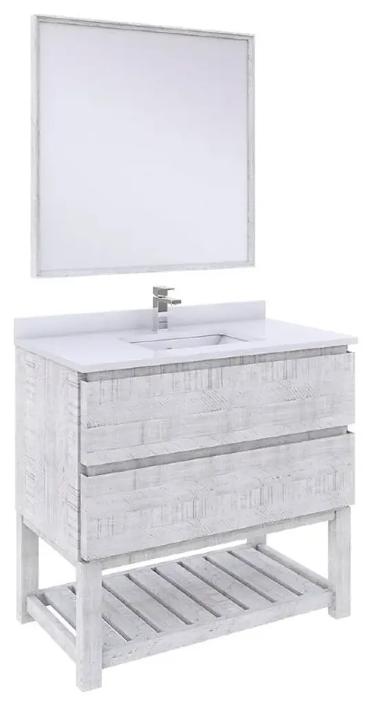 Fresca Formosa 36" Modern Rustic White Bathroom Vanity Set w/ Open BottomThe Fresca Formosa Slat Bottom Open Shelf Bathroom Vanity is superbly crafted of solid Acacia wood, known for its magnificent beauty and durability. It has a warm grey finish with a hint of brown throughout, and a natural grain that will inject luxurious warmth into any space. A masterpiece of elegance and style, this free-standing vanity measures 36" in width. Two solid wood, soft-closing dovetail drawers are perfect for organizing all of your daily essentials. The solid pine drawers are clear coated and feature a mitered, wrap-around design that adds to the superior detailing. Cove routed pulls are carved directly into the drawers keeping the design sharp and sophisticated. This handsome vanity also has an open slatted shelf on the bottom, perfect for storing hand towels or other bathroom necessities. Gracing the top of the vanity is a stunning 36" quartz stone countertop and ceramic undermount basin. The white ceramic basin is equipped with an overflow and the countertop has been pre-drilled to accommodate the faucet of your choice. A p-trap, pop-up drain and installation hardware are included. This Formosa Wall Mount Bathroom Vanity comes with a matching 30" Acacia Mirror with a frame that is cove routed and mitered, providing the perfect finishing touch.Vanity Set Features:Dimensions of Vanity: 36"W x 20.4"D x 34.9"HDimensions of Mirror: 32"W x 32"H x 1.4"DMaterials: Solid Acacia Wood Construction, Quartz Stone Countertop, Ceramic Undermount Sink w/ OverflowSingle Hole Faucet Mount (Faucet Shown In Picture May No Longer Be Available So Please Check Compatible Faucet List)2 Soft Closing Dovetail DrawersMitered Wrap Around Drawer DesignSeamless Countertop w/ Matching BacksplashMitered, Cove Routed, Solid Wood Mirror FrameFully Covered Back PanelIncluded: Main Cabinet, Shelf Base, Countertop, Sink, Faucet, Mirror, P-trap, Pop-Up Drain and Installation HardwareVanity Set Specifications:Cabinet Finish: Rustic WhiteMaterial: Solid WoodSink Shape: RectangleSink Type: UndermountSink Configuration: SingleSink Dimensions: 15.13"x10.38"x6.75"Countertop Material: Quartz StoneVanity Style: ModernVanity Installation: Freestanding