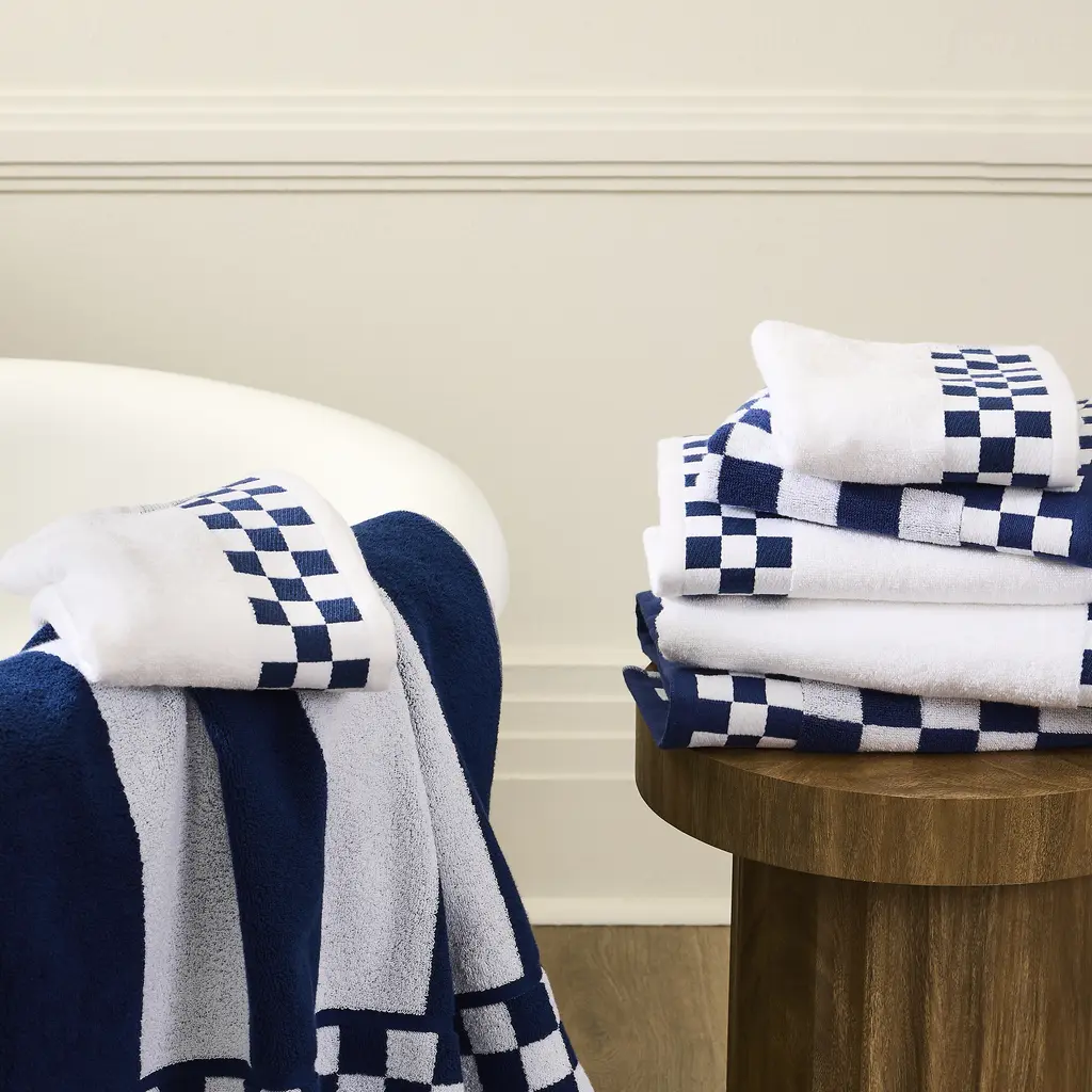 Make a splash with the plush feel and elegant checks of this Hand Towel with Navy Check Border. Made of soft cotton terrycloth and trimmed with refined navy and white checks. Give your bath an instant makeover and turn scrubbing up into something spectacular.