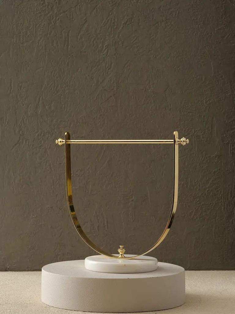 The Brass Arched Towel Holder is a refined fusion of classic charm and modern functionality. Featuring a sleek, U-shaped gold-finished brass frame anchored by a smooth white marble base, it elevates everyday bathroom rituals with its sculptural presence. Ideal for hand towels or guest linens, this piece brings a touch of hotel-style luxury to your countertop or vanity space.
