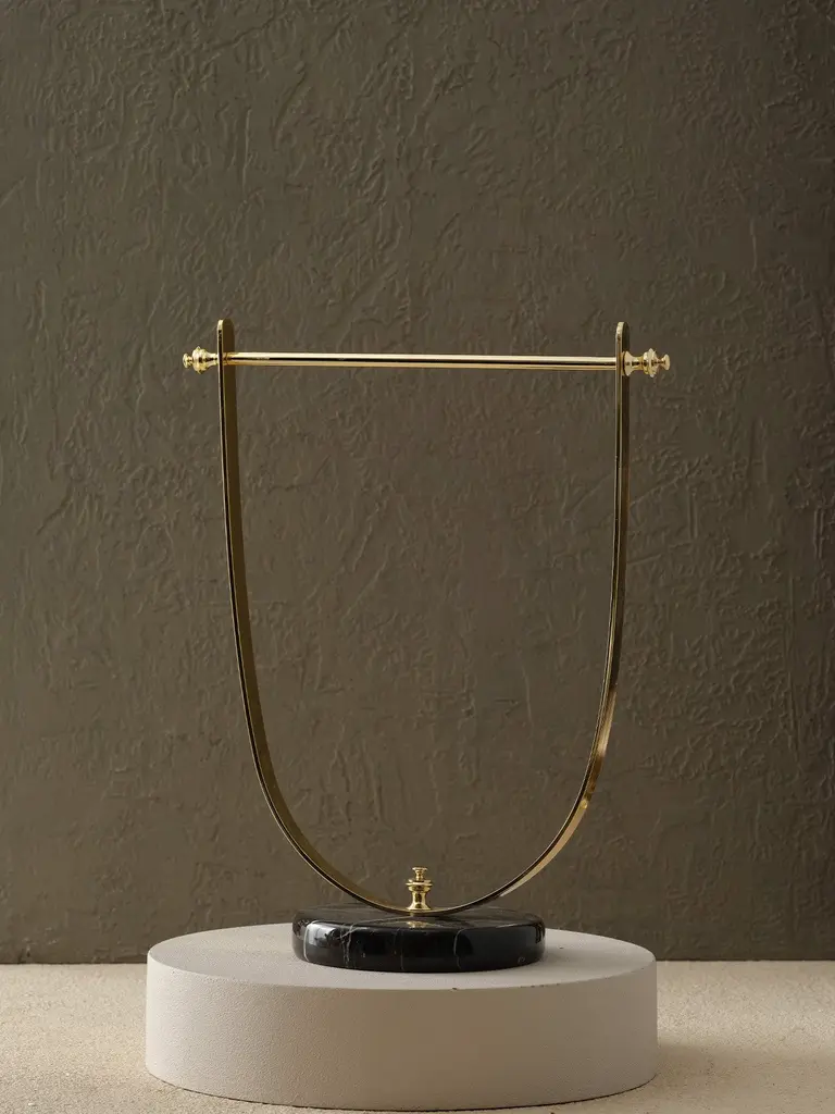The Brass Towel Holder with Black Marble Base is a refined accessory that elevates everyday rituals with elegance and structure. Featuring a classic U-shaped brass frame in a polished gold finish, it gracefully suspends hand towels or guest linens while sitting atop a striking black marble base. The combination of gleaming metal and natural stone makes it a statement piece for modern bathrooms or vanity setups, adding both style and sophistication.